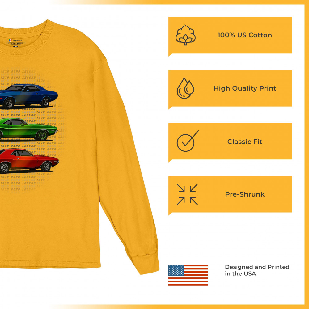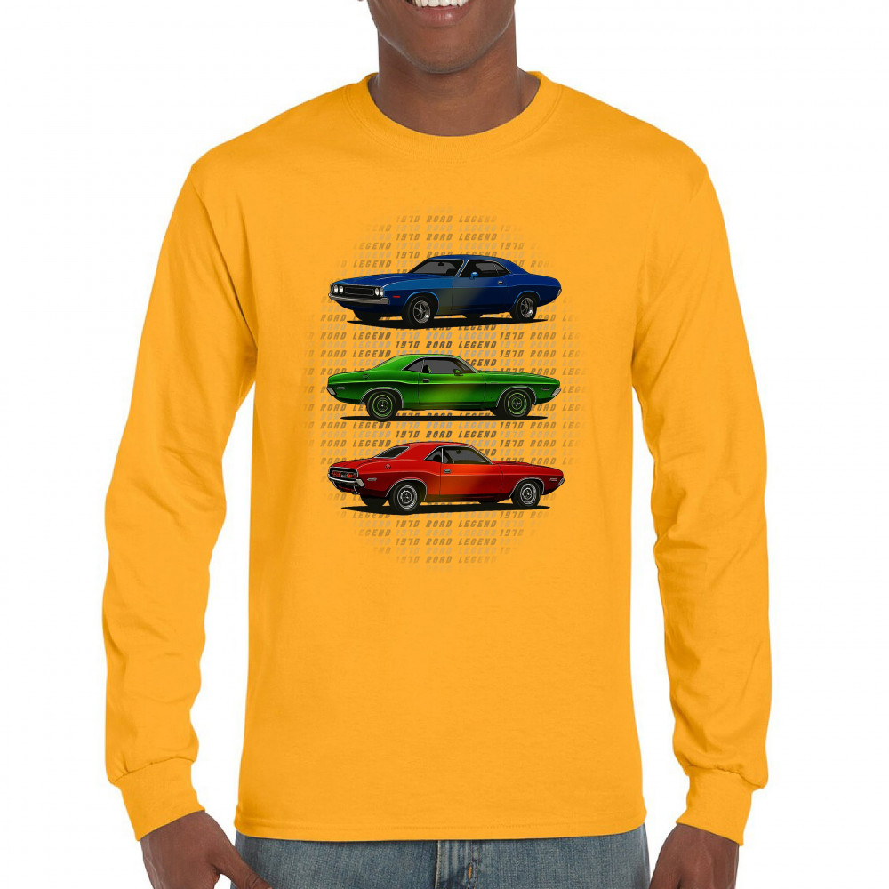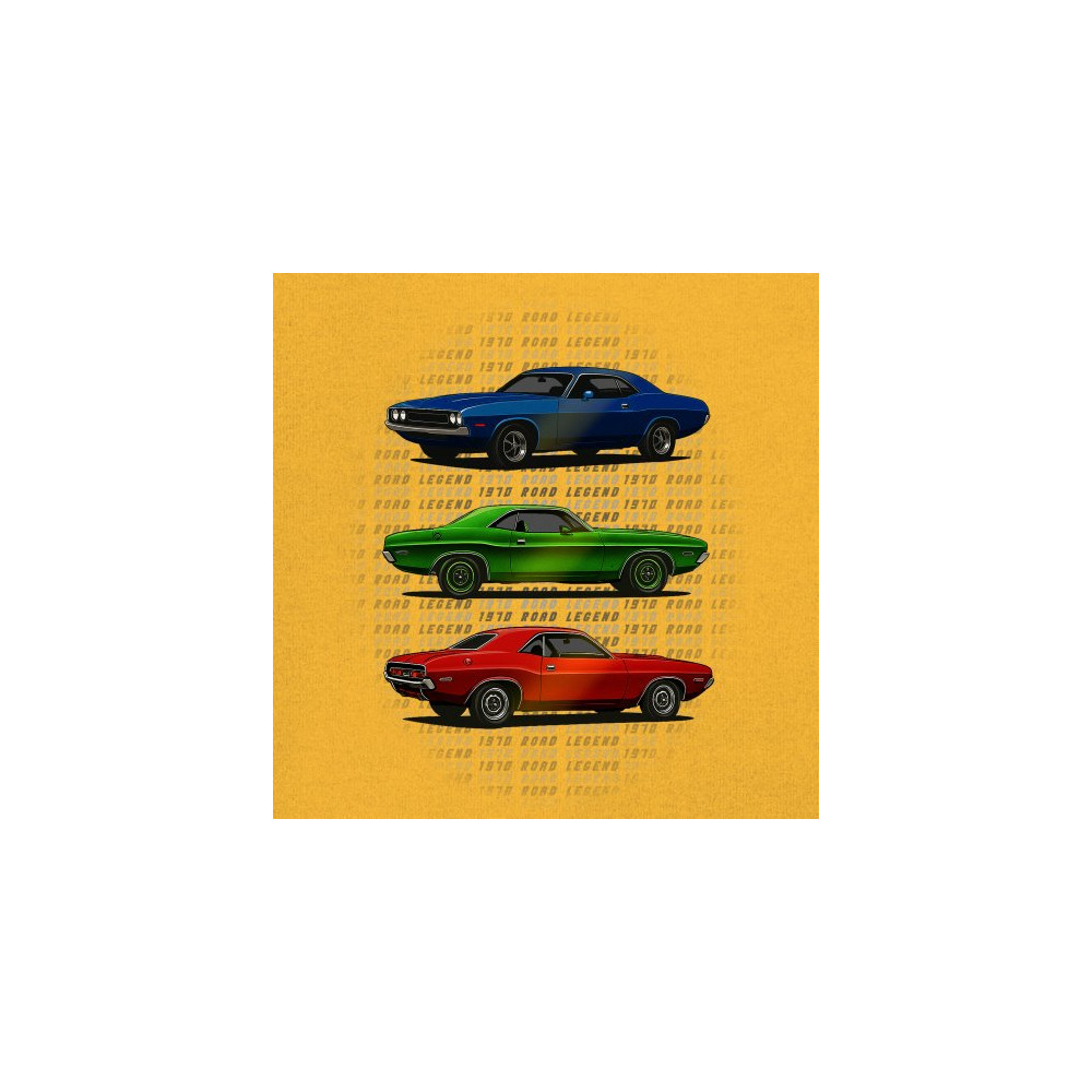 Three bold 1970 muscle cars, stacked in red, green, and blue, celebrate vintage power and road legend status. This retro-inspired design captures the essence of American car culture—made for gearheads, V8 fans, and anyone who lives for classic performance, heritage, and style.