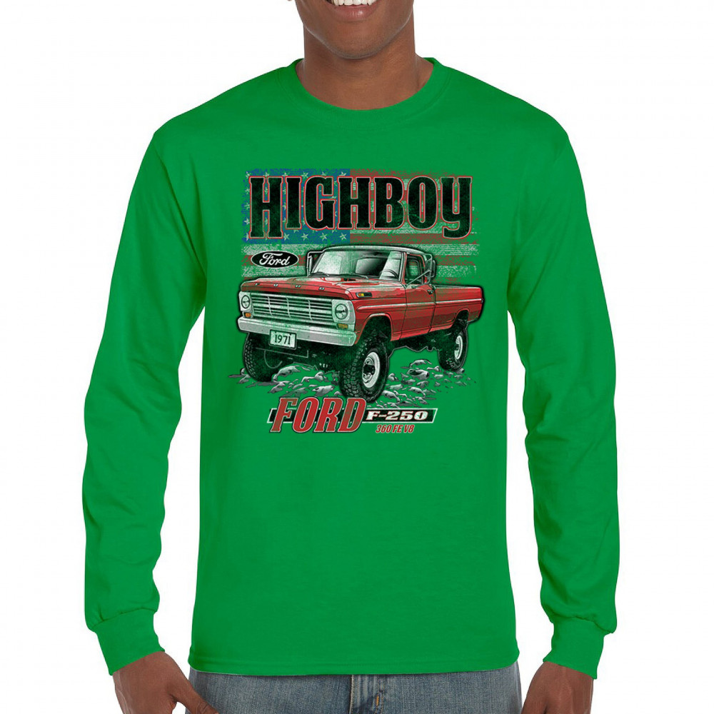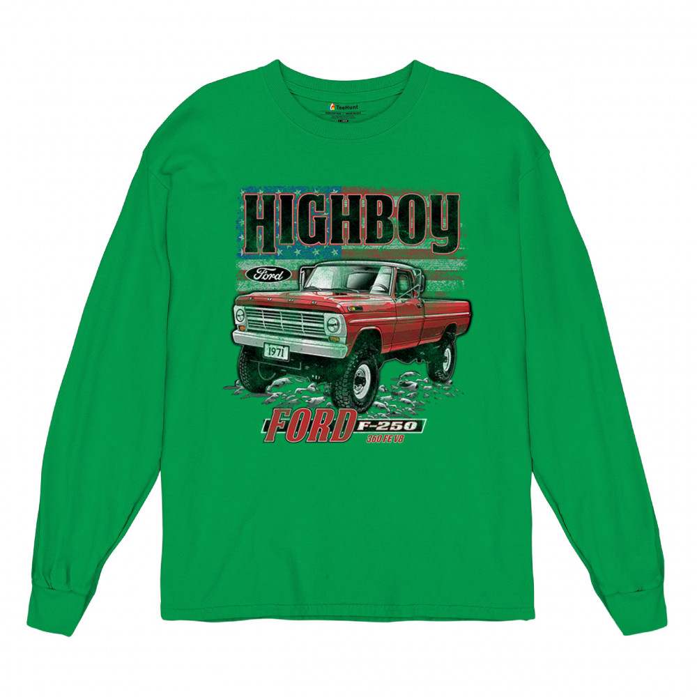 This vintage truck design features a 1971 Ford F-250 Highboy 4x4 with a classic lifted stance and patriotic flag background. Bold and nostalgic, it’s perfect for classic truck fans, 4x4 lovers, off-roaders, and collectors who appreciate American V8 tradition. Show it off at truck shows, meets, or cruise nights.
