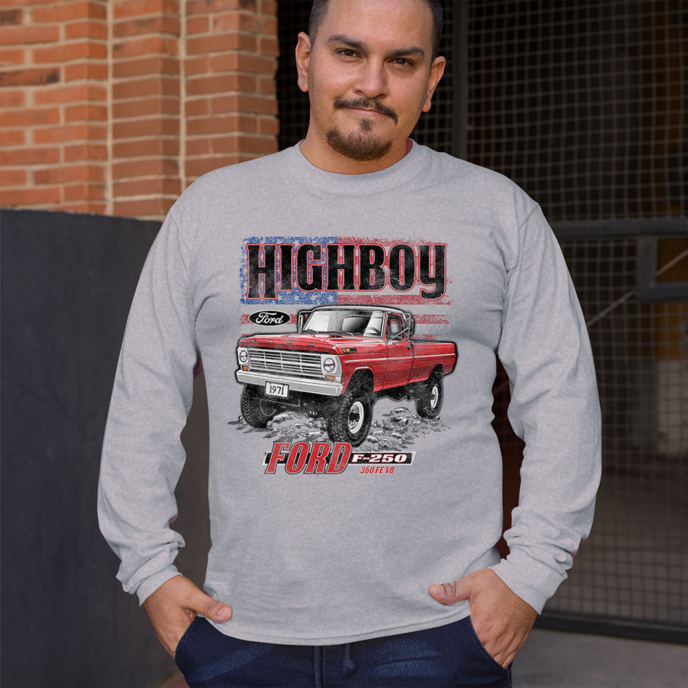 This vintage truck design features a 1971 Ford F-250 Highboy 4x4 with a classic lifted stance and patriotic flag background. Bold and nostalgic, it’s perfect for classic truck fans, 4x4 lovers, off-roaders, and collectors who appreciate American V8 tradition. Show it off at truck shows, meets, or cruise nights.
