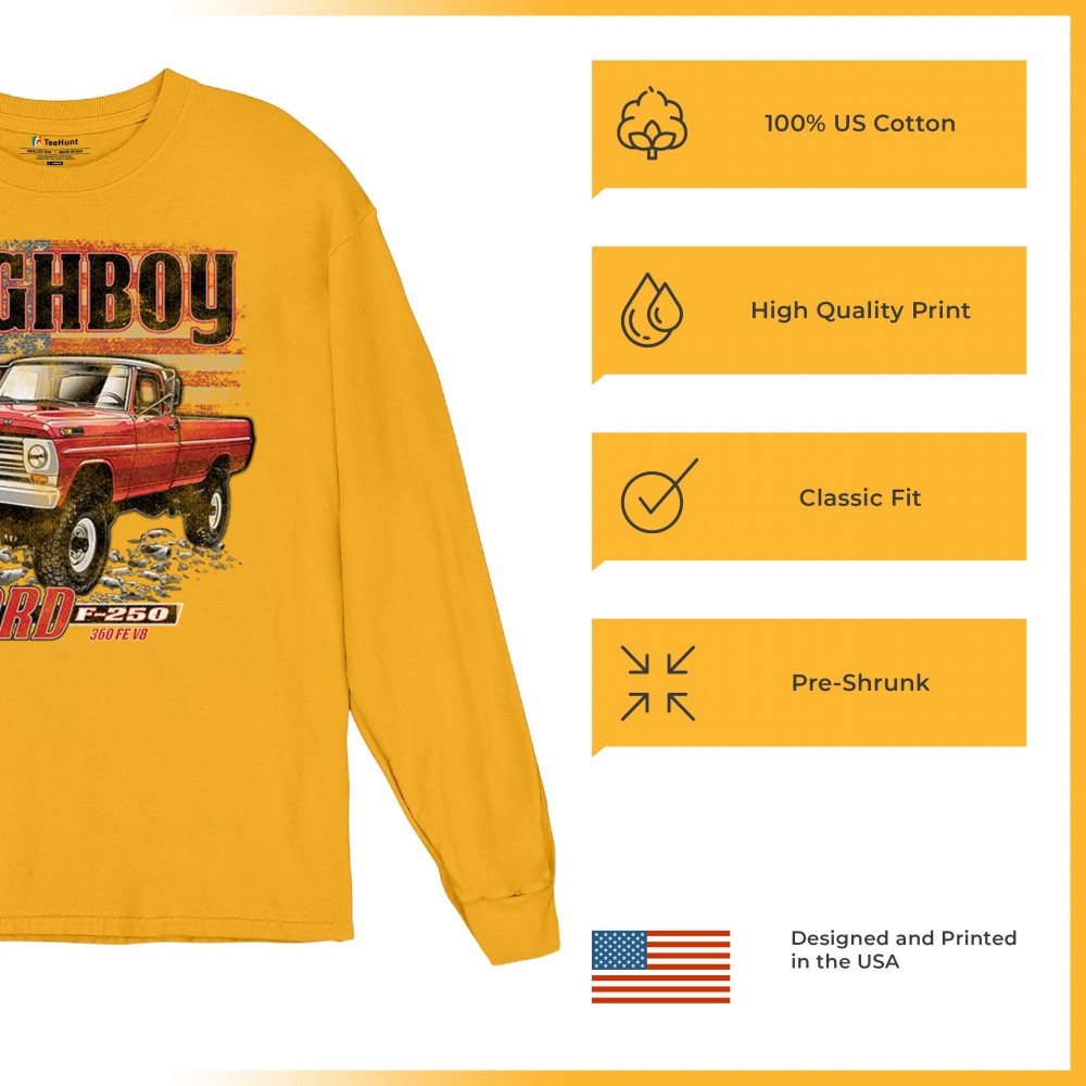 This vintage truck design features a 1971 Ford F-250 Highboy 4x4 with a classic lifted stance and patriotic flag background. Bold and nostalgic, it’s perfect for classic truck fans, 4x4 lovers, off-roaders, and collectors who appreciate American V8 tradition. Show it off at truck shows, meets, or cruise nights.