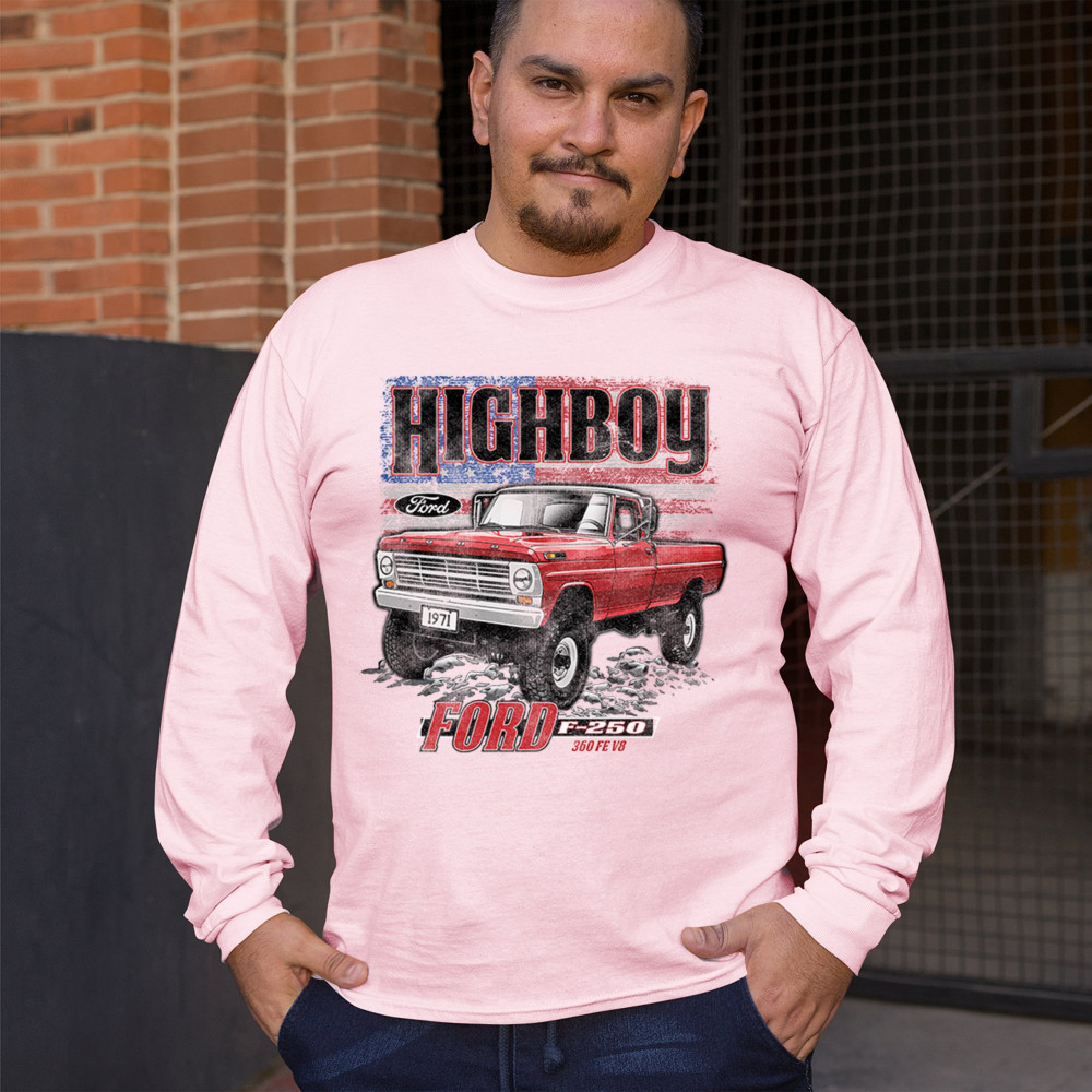 This vintage truck design features a 1971 Ford F-250 Highboy 4x4 with a classic lifted stance and patriotic flag background. Bold and nostalgic, it’s perfect for classic truck fans, 4x4 lovers, off-roaders, and collectors who appreciate American V8 tradition. Show it off at truck shows, meets, or cruise nights.