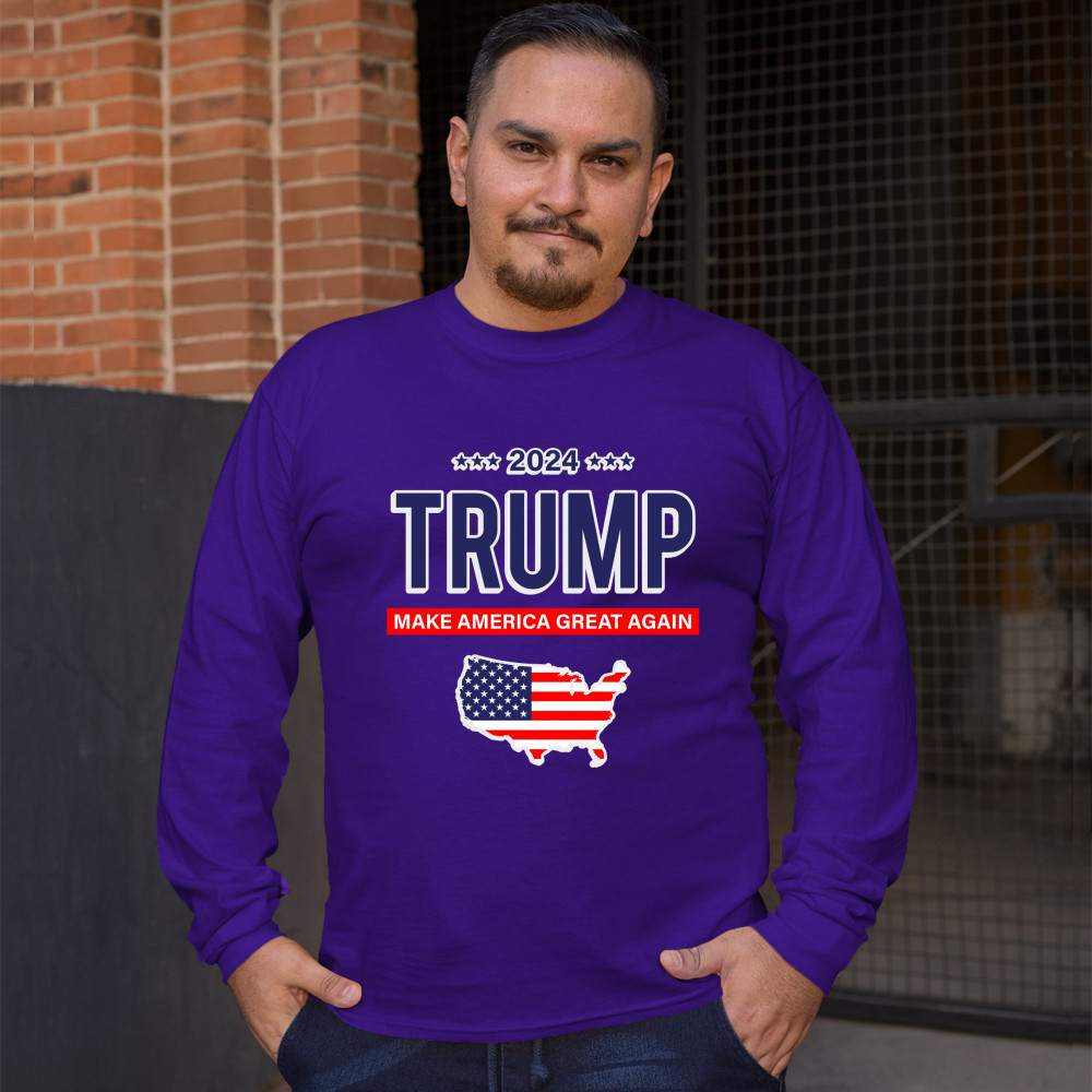 A political print saying "2024 Trump Make America Great Again" and features the silhouette of the USA with the American flag inside of it. A great choice to wear for a Trump rally or give as a gift to a Donald Trump supporter before 2024 presidential elec