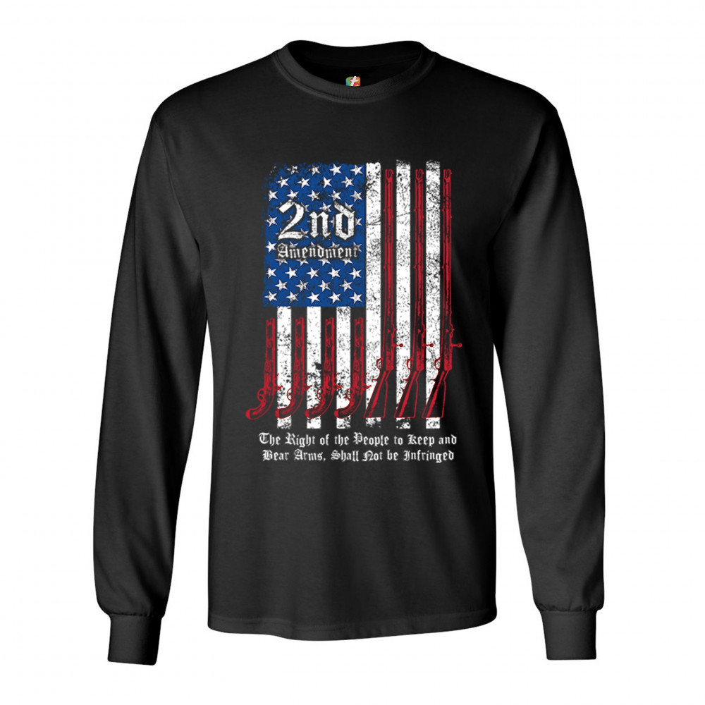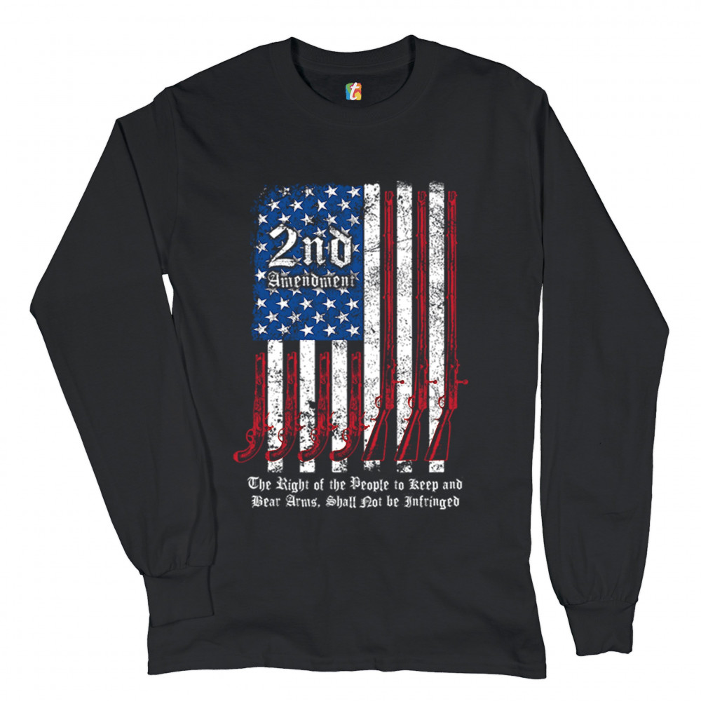 A print featuring a distressed American flag with pistols and muskets instead of red stripes. Atop of the 50 stars "2nd Amendment" is written. The print says: "The Right of the People to Keep and Bear Arms, Shall Not be Infringed ". Great choice for any g