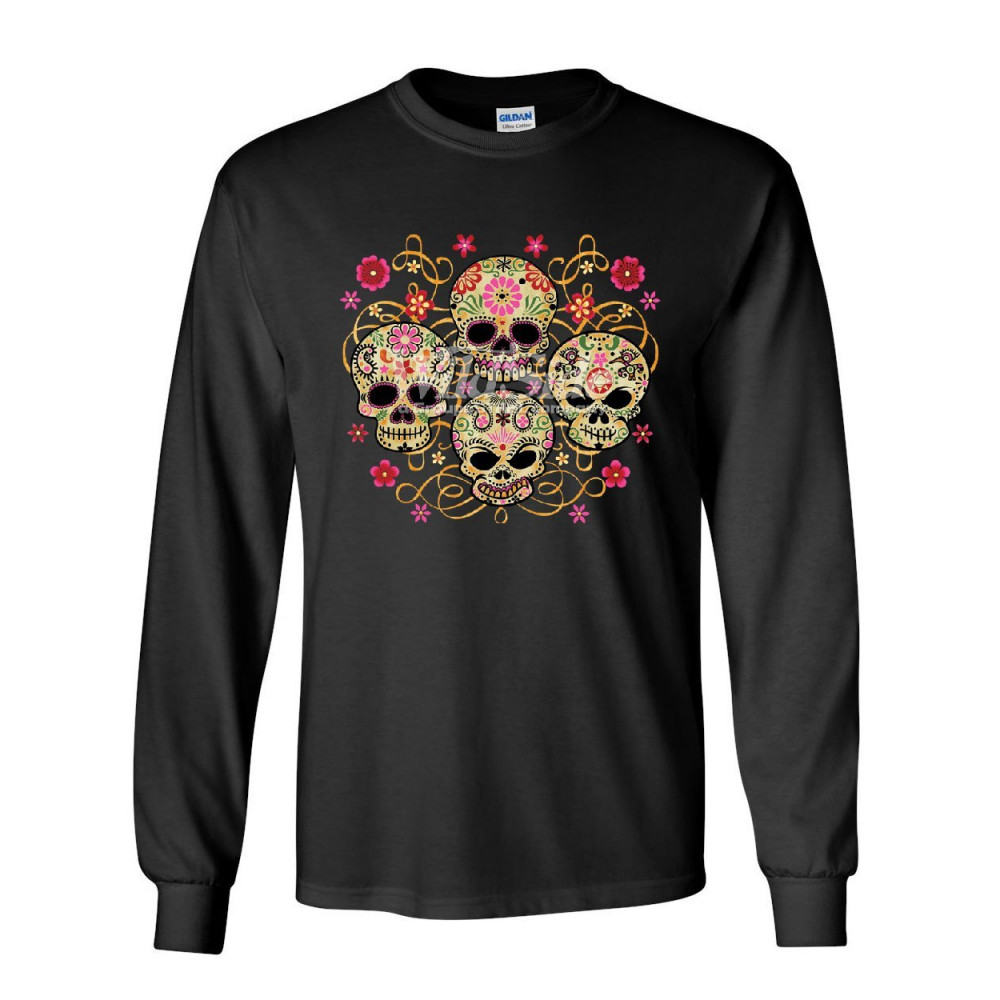 4 CUTE SUGAR SKULLS long sleeve t-shirt calaveras dia de los muertos mexico tee black