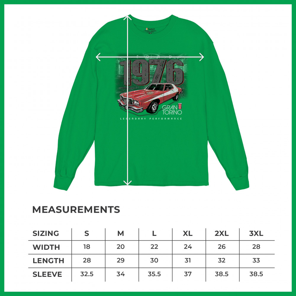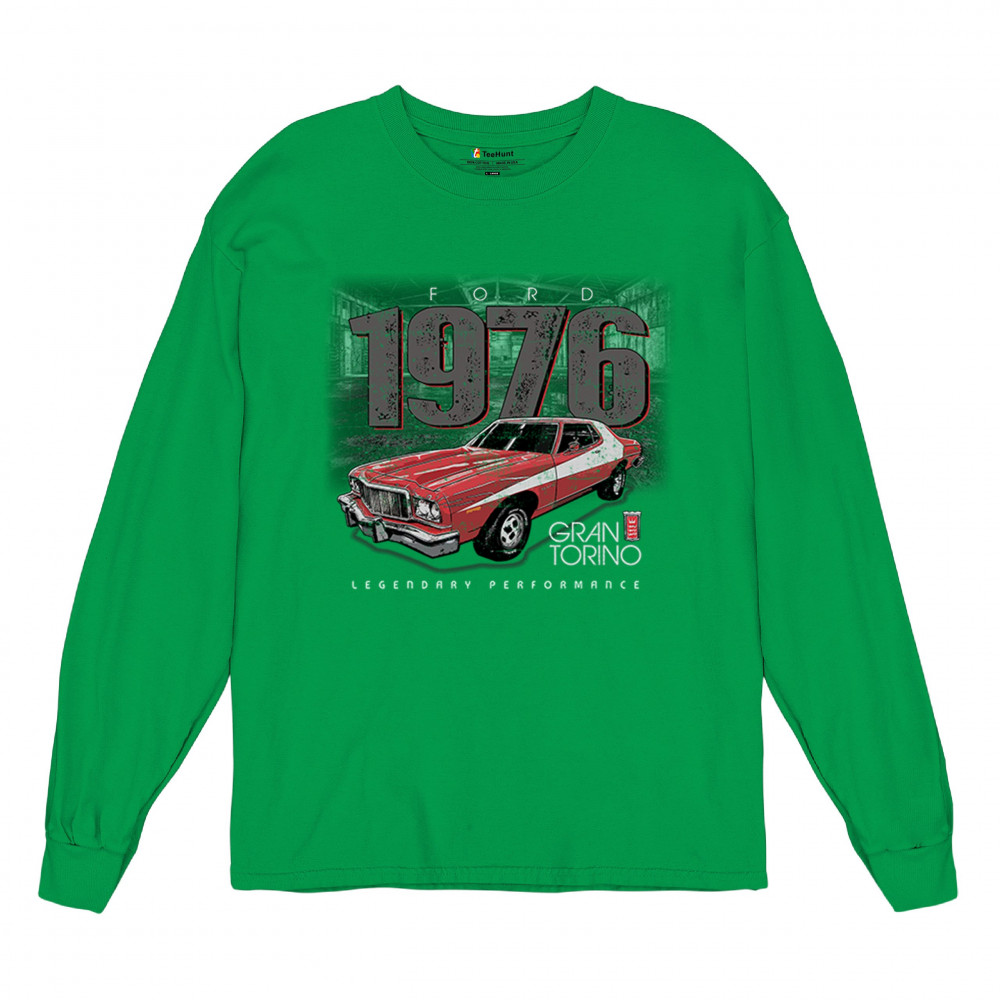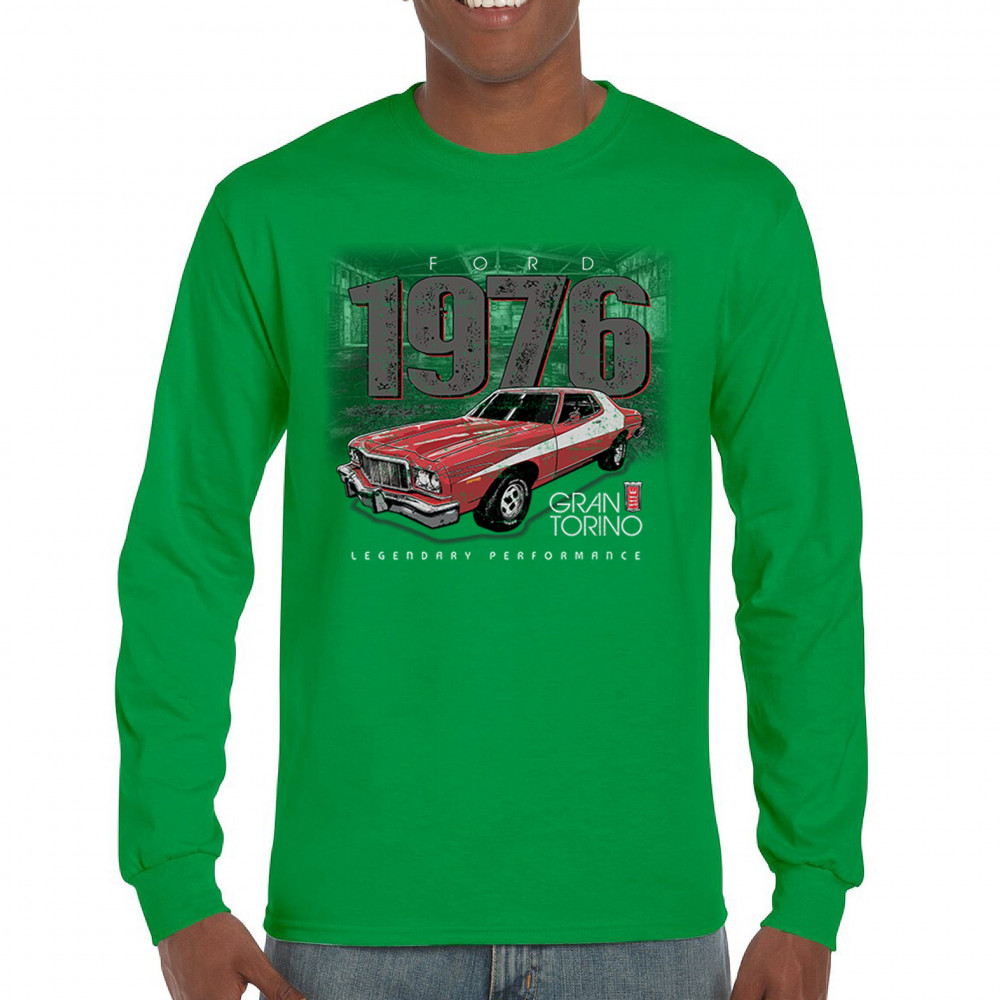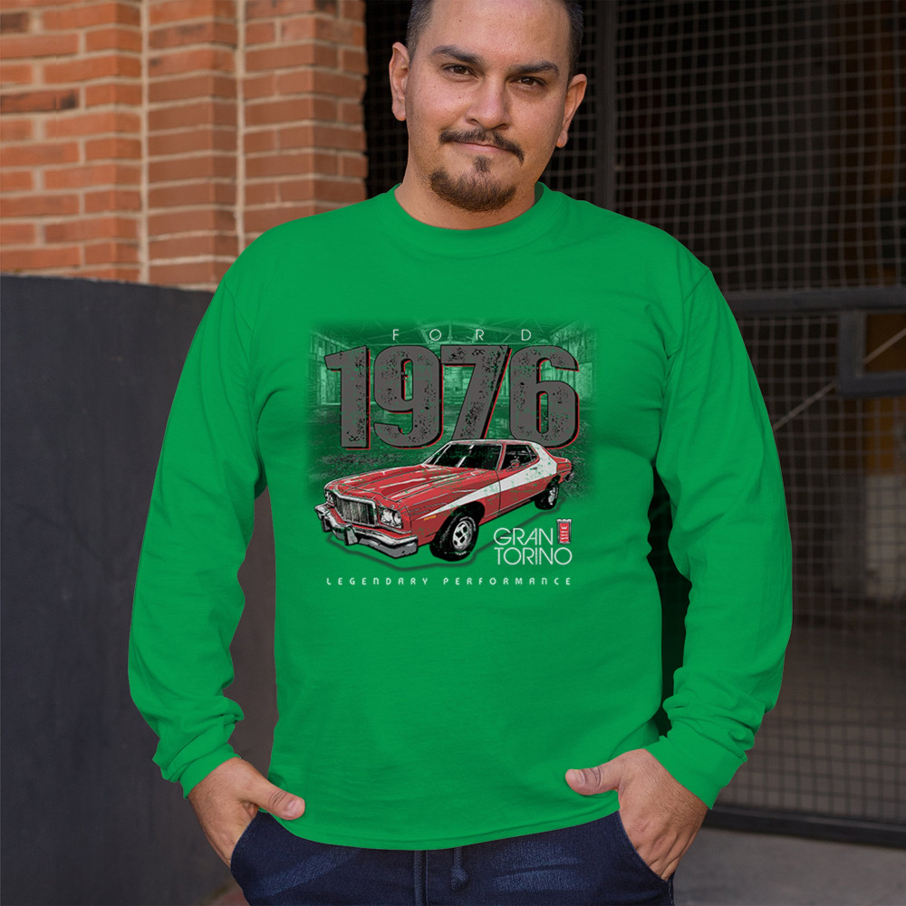 1976 Ford Gran Torino design with red and white retro style. Perfect for muscle car fans, Ford lovers, and classic car event gear.