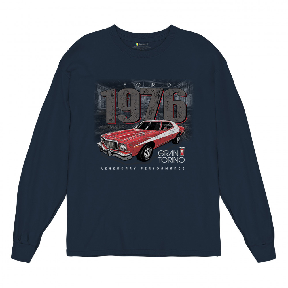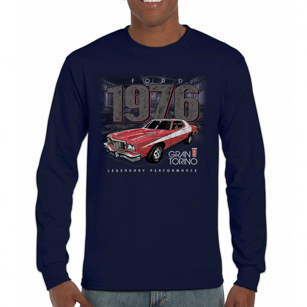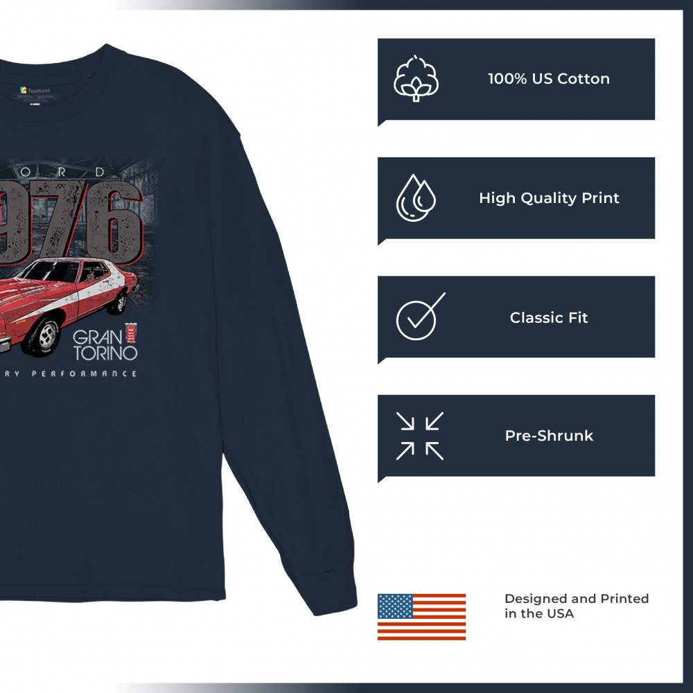 1976 Ford Gran Torino design with red and white retro style. Perfect for muscle car fans, Ford lovers, and classic car event gear.