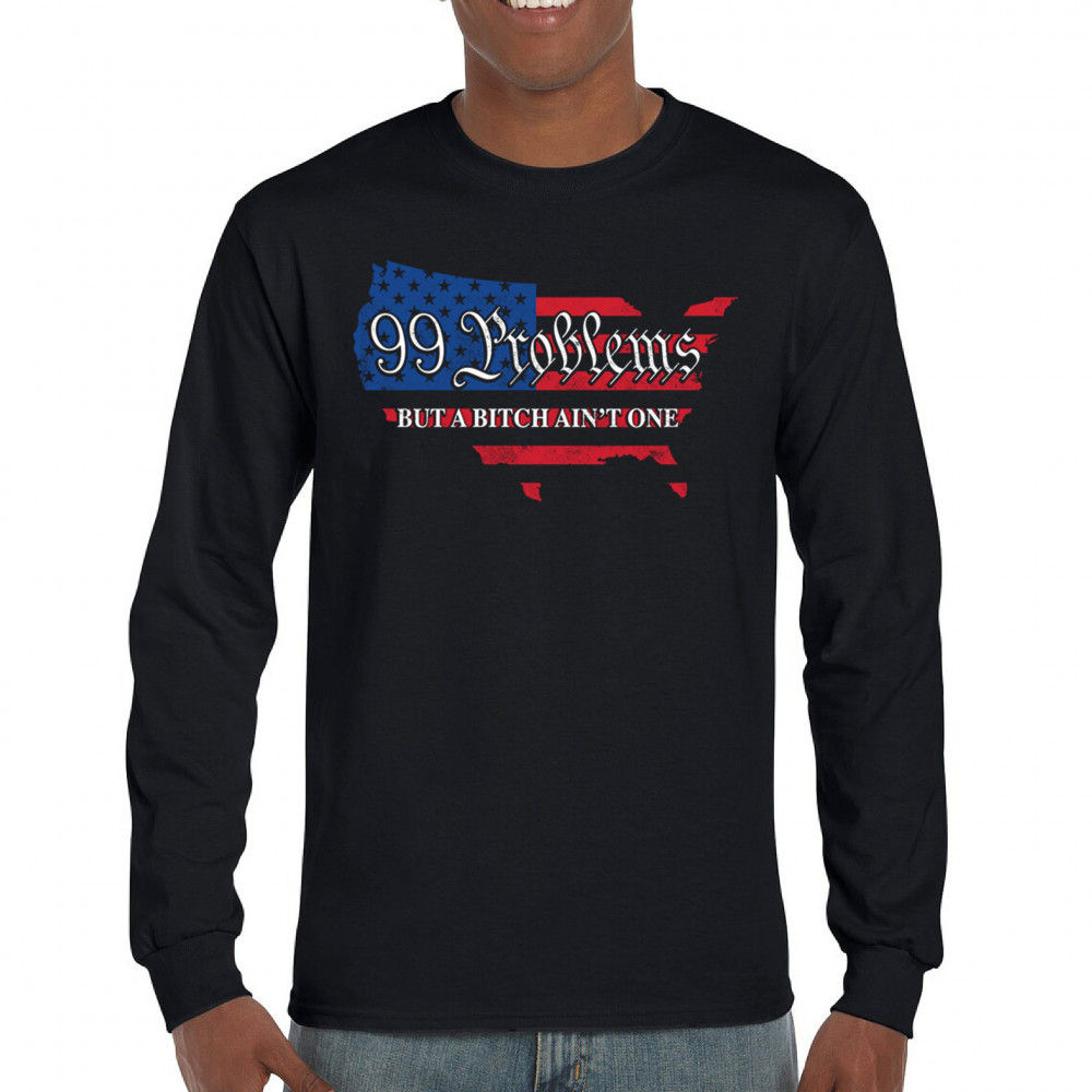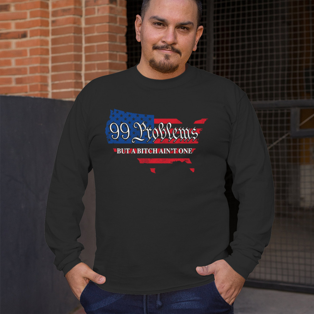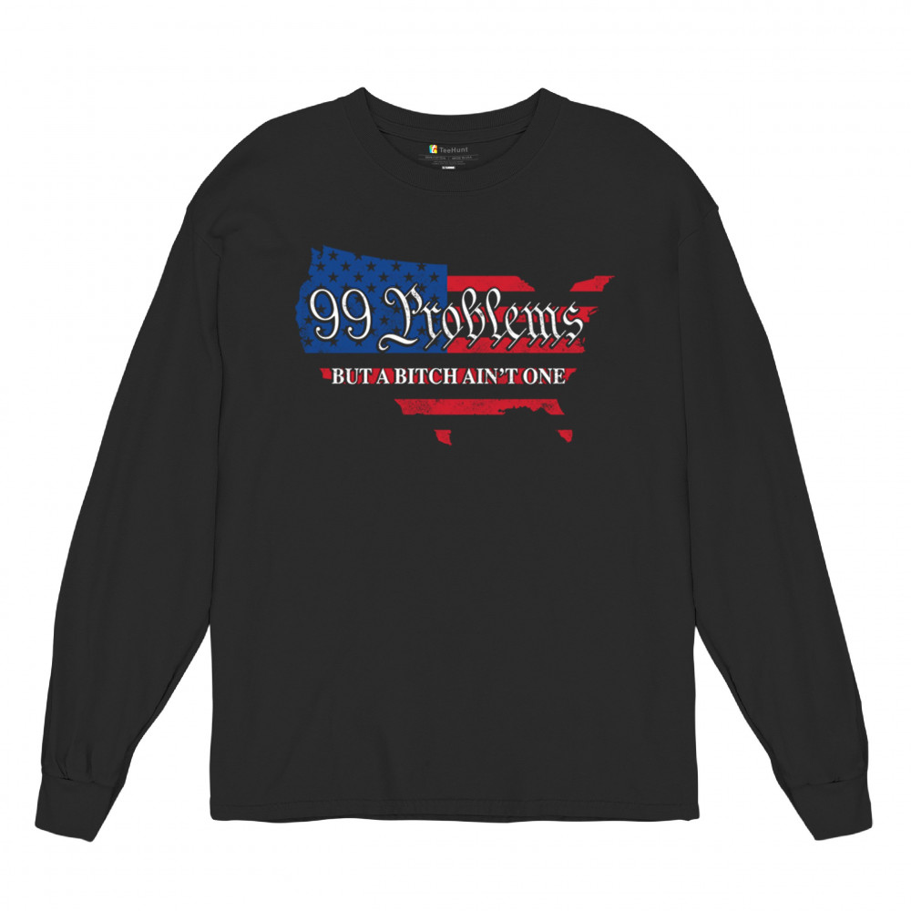 Embrace your patriotic spirit with this striking "99 Problems But a B*tch Ain't One" design, blending the American map and flag-inspired elements. Perfect for Trump supporters, conservatives, and all who believe in the values of freedom, victory, and the Republican Red Wave. Celebrate your commitment to America and make a statement that reflects your unwavering belief in the people's mandate and the party of common sense.
