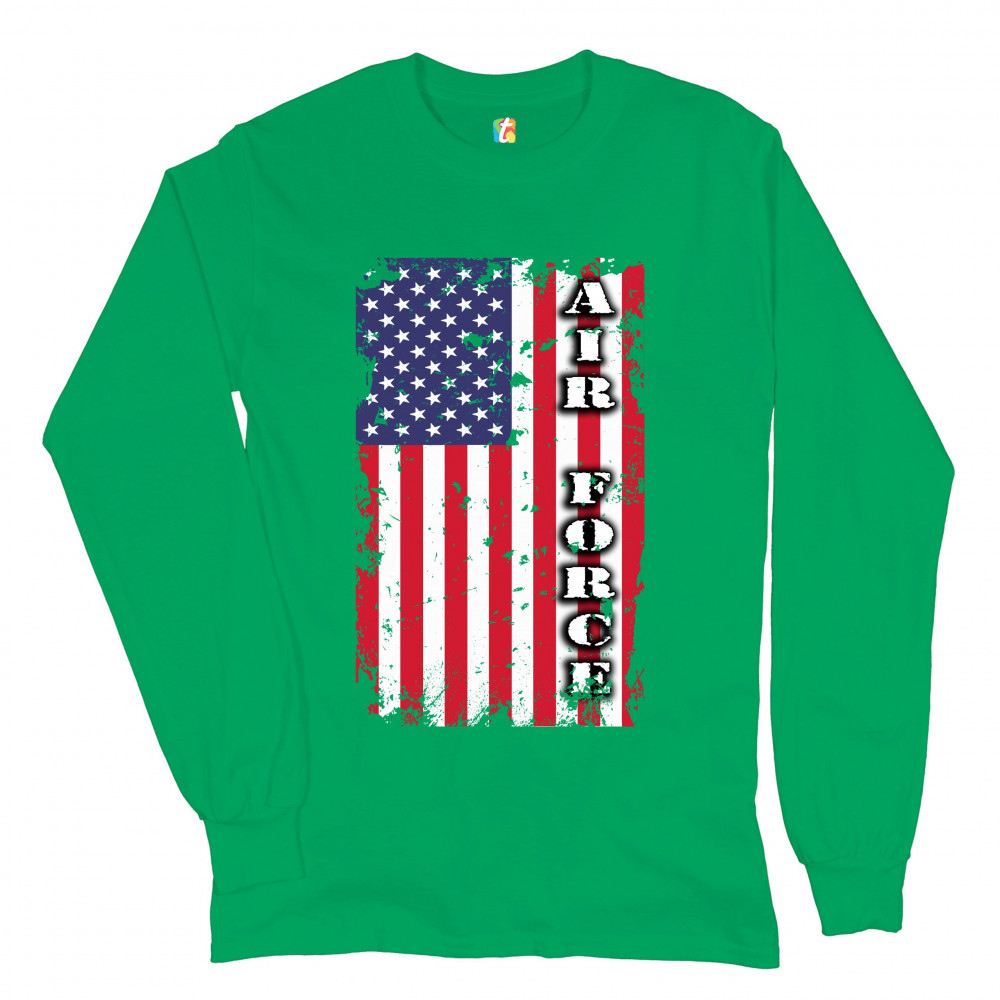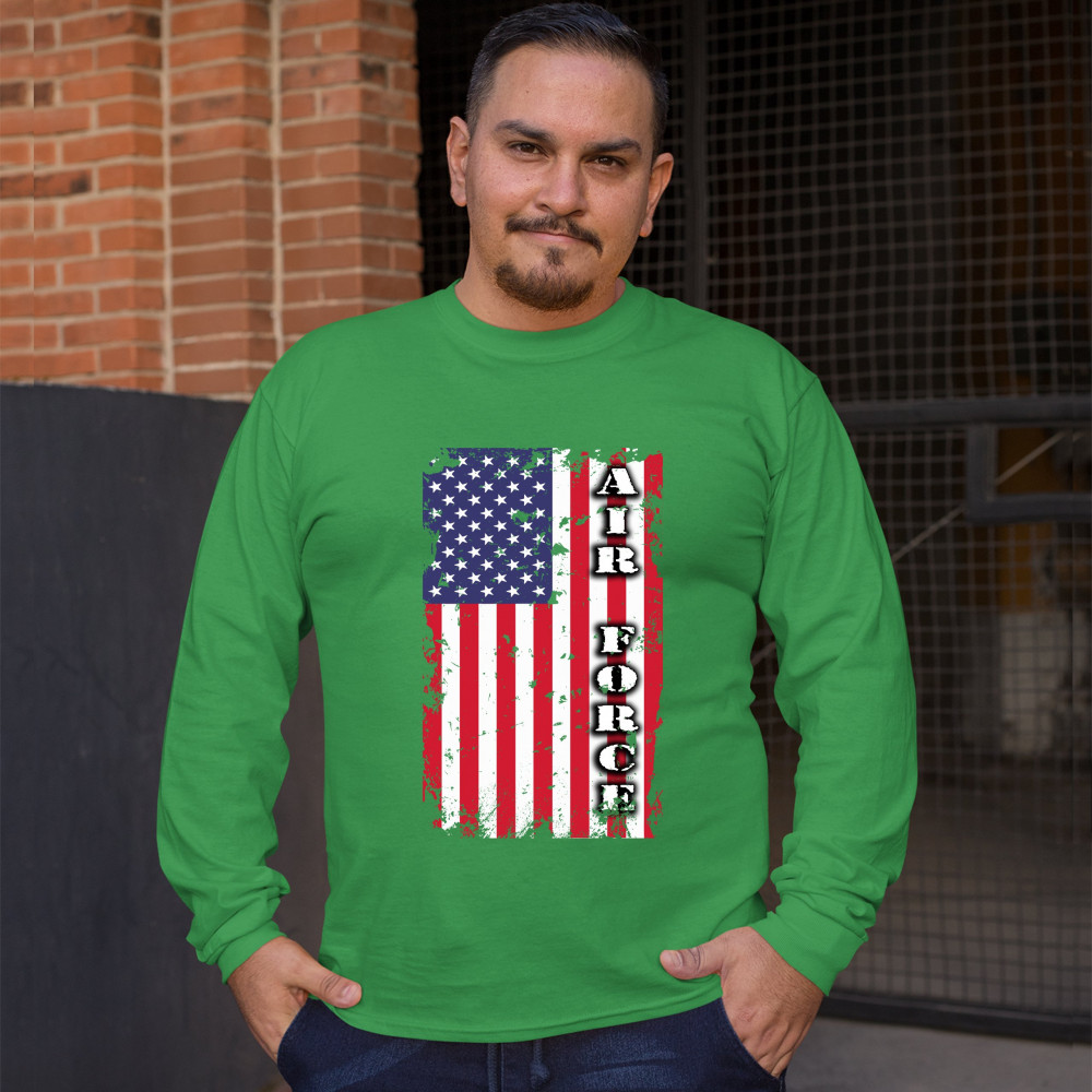 A patriotic print featuring a distressed American flag with "Air Force" written over it. Great choice to wear on Independence Day or any other patriotic holiday.