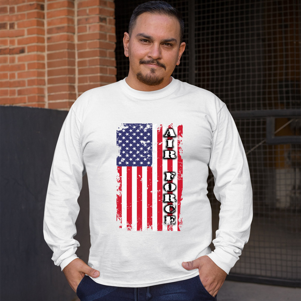 A patriotic print featuring a distressed American flag with "Air Force" written over it. Great choice to wear on Independence Day or any other patriotic holiday.