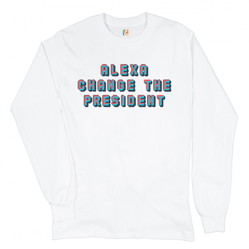 A print saying "Alexa Change the President". A great choice to wear to a Trump rally or give as a gift to a Donald Trump supporter before 2024 presidential elections.