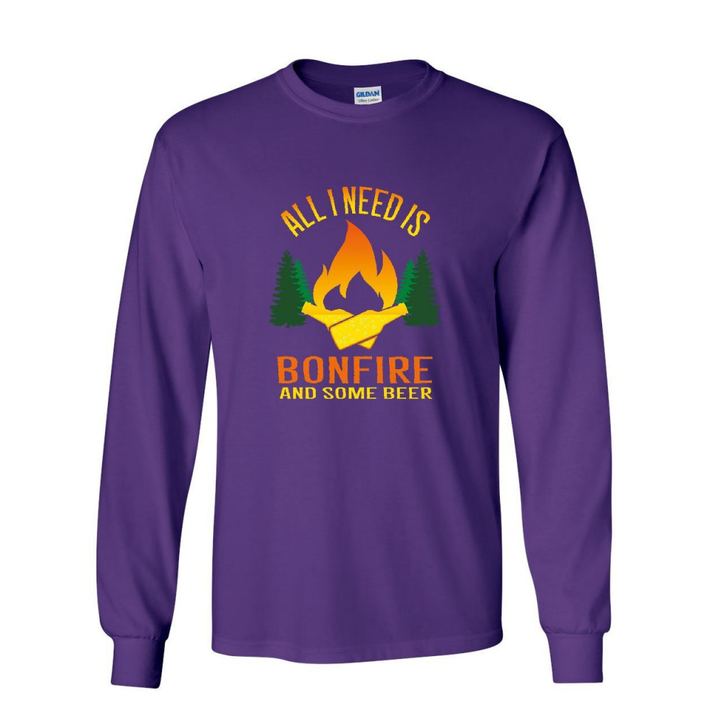 ALL I NEED IS BONFIRE & SOME BEER long sleeve t-shirt funny camping drinking tee purple
