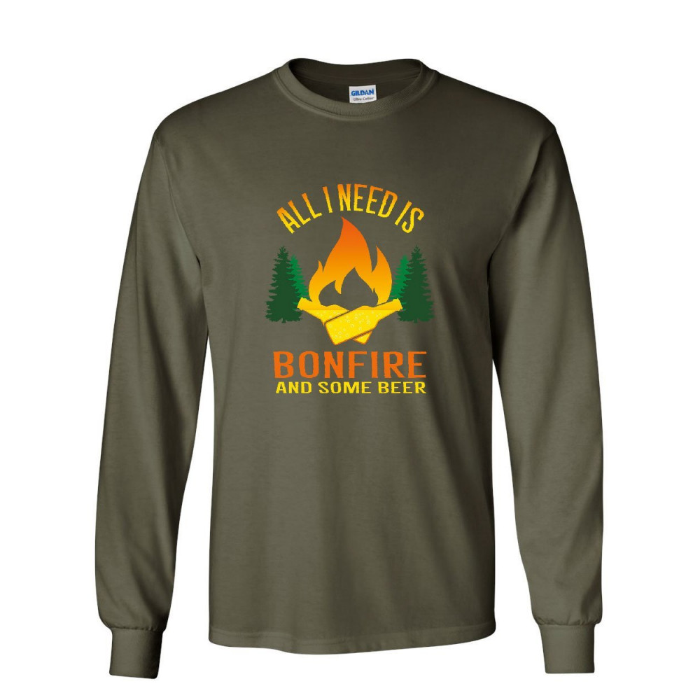 ALL I NEED IS BONFIRE & SOME BEER long sleeve t-shirt funny camping drinking tee military green