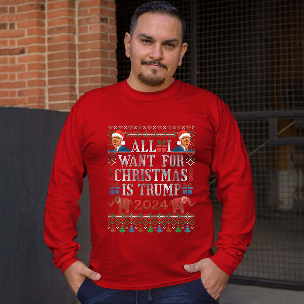 A funny print saying: "All I Want for Christmas Is Trump 2024". The print is decorated as a Christmas ugly sweater and features faces of Donald Trump wearing Christmas hats and two elephants. A great choice to wear for a Christmas or New Year's Eve party