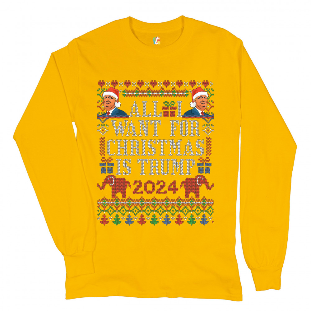 A funny print saying: "All I Want for Christmas Is Trump 2024". The print is decorated as a Christmas ugly sweater and features faces of Donald Trump wearing Christmas hats and two elephants. A great choice to wear for a Christmas or New Year's Eve party