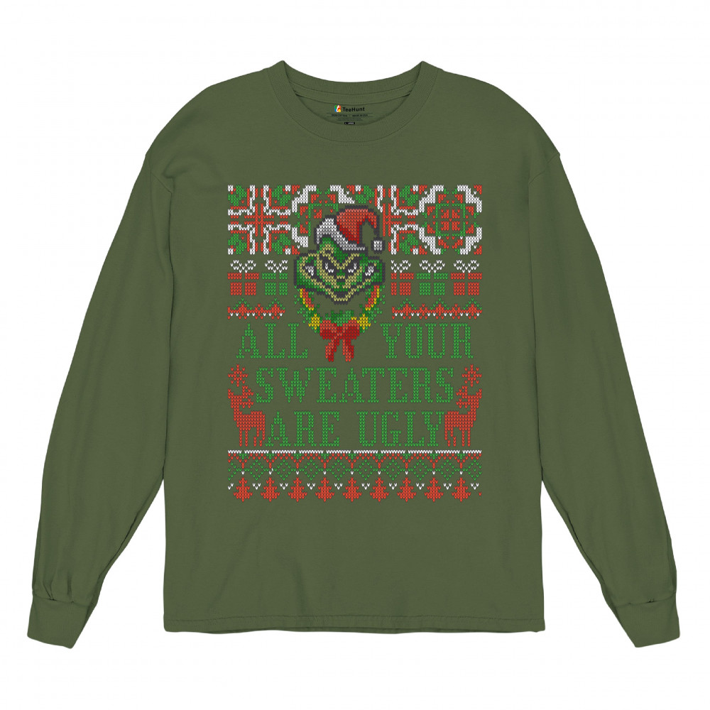 ALL YOUR SWEATERS ARE UGLY long sleeve t-shirt funny merry christmas rudolph military green