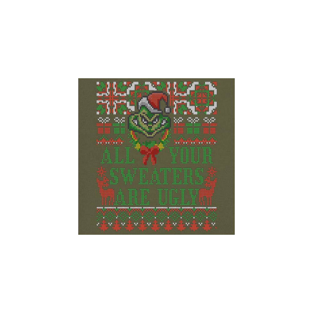 A funny print saying: "All Your Sweaters Are Ugly" and featuring a green goblin's face and two reindeers. The print is decorated as an ugly sweater. Amazing choice to make people smile and spread positive vibes on Christmas Eve.