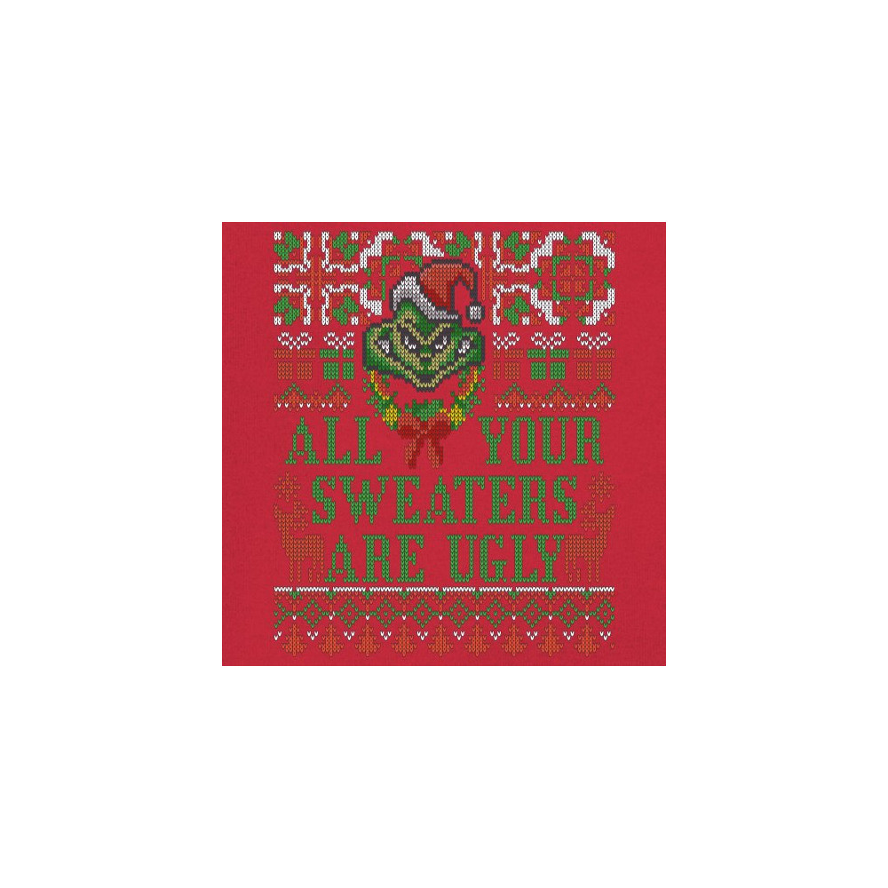 A funny print saying: "All Your Sweaters Are Ugly" and featuring a green goblin's face and two reindeers. The print is decorated as an ugly sweater. Amazing choice to make people smile and spread positive vibes on Christmas Eve.