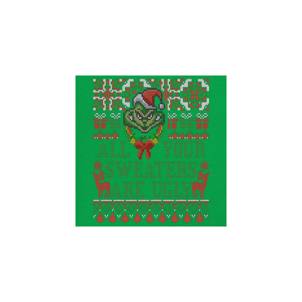 A funny print saying: "All Your Sweaters Are Ugly" and featuring a green goblin's face and two reindeers. The print is decorated as an ugly sweater. Amazing choice to make people smile and spread positive vibes on Christmas Eve.