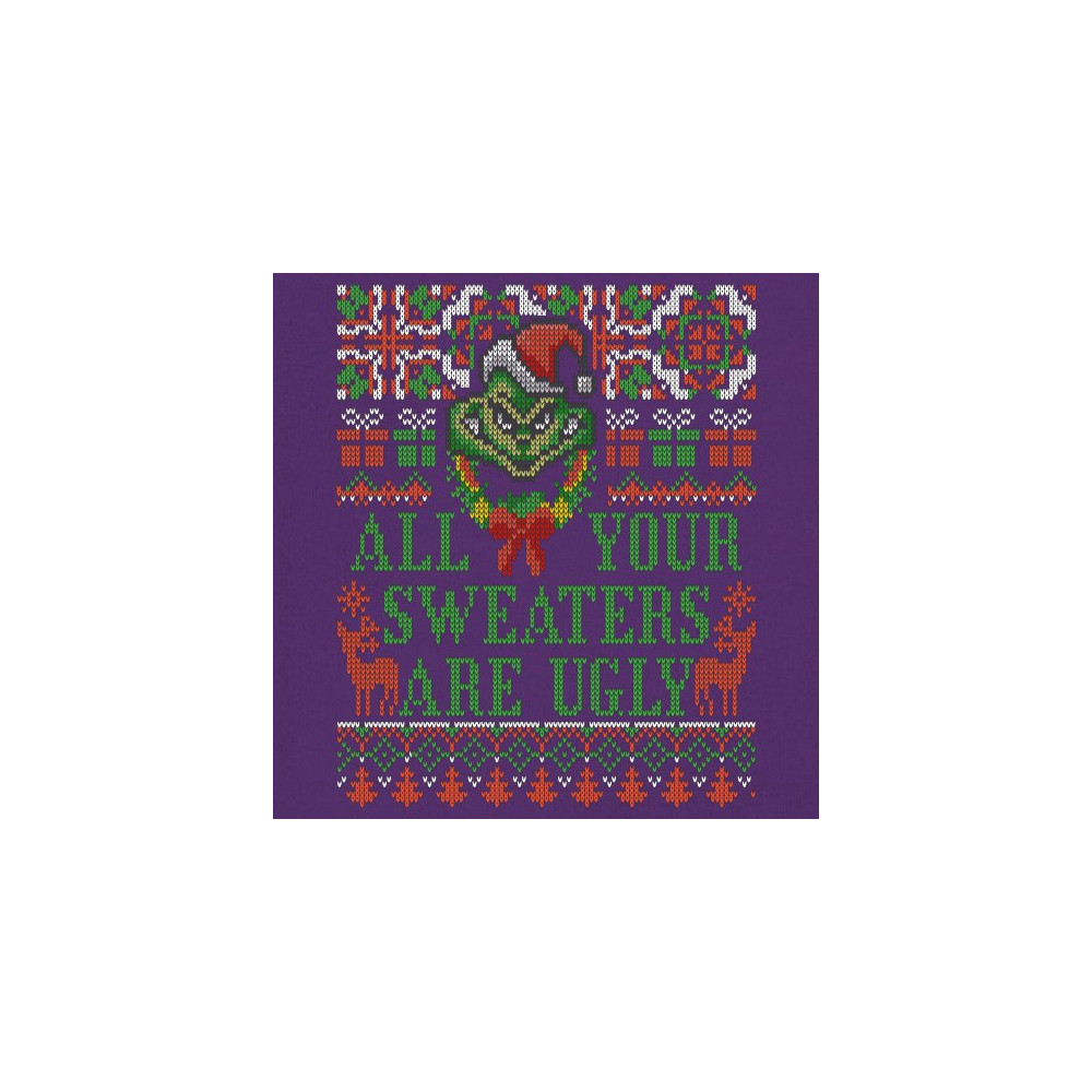 A funny print saying: "All Your Sweaters Are Ugly" and featuring a green goblin's face and two reindeers. The print is decorated as an ugly sweater. Amazing choice to make people smile and spread positive vibes on Christmas Eve.