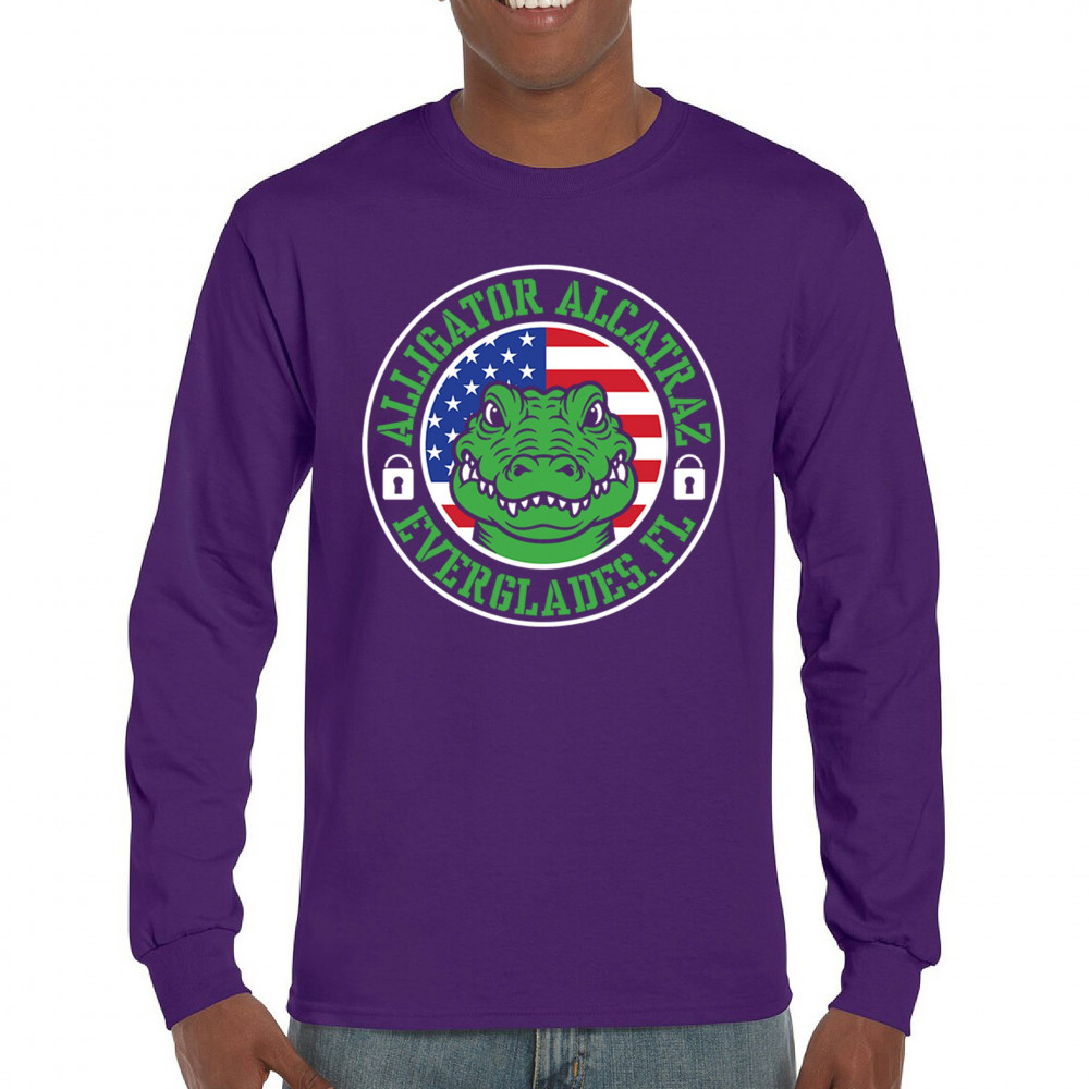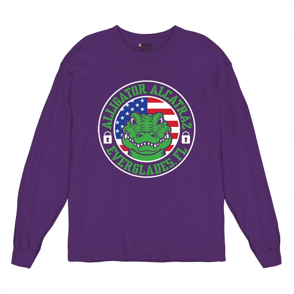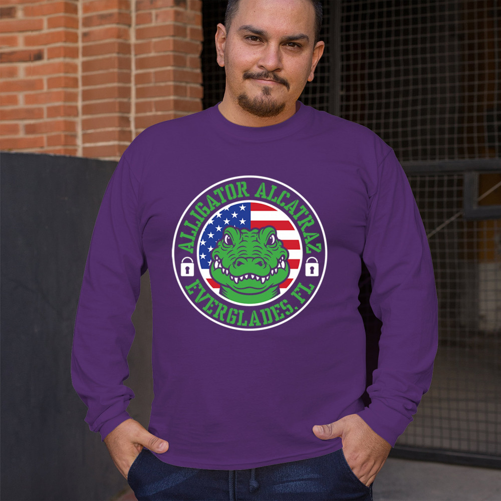 Bold Alligator Alcatraz design with USA flag and conservative message. Patriotic, America First, and proud to take a stand for national values.