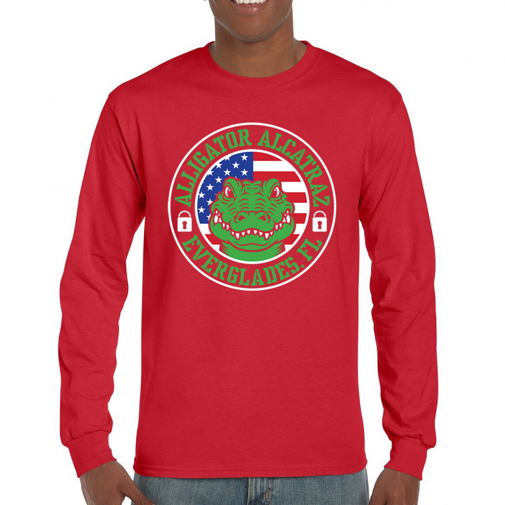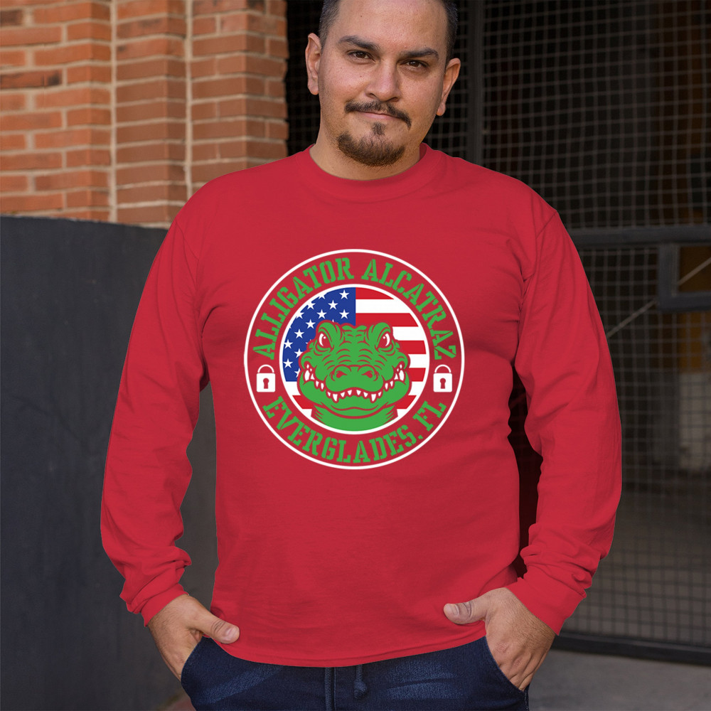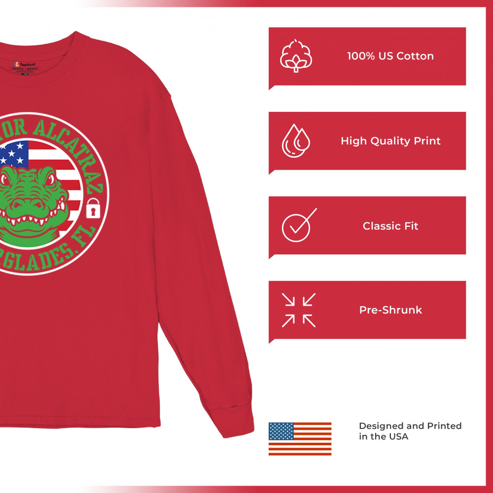 Bold Alligator Alcatraz design with USA flag and conservative message. Patriotic, America First, and proud to take a stand for national values.
