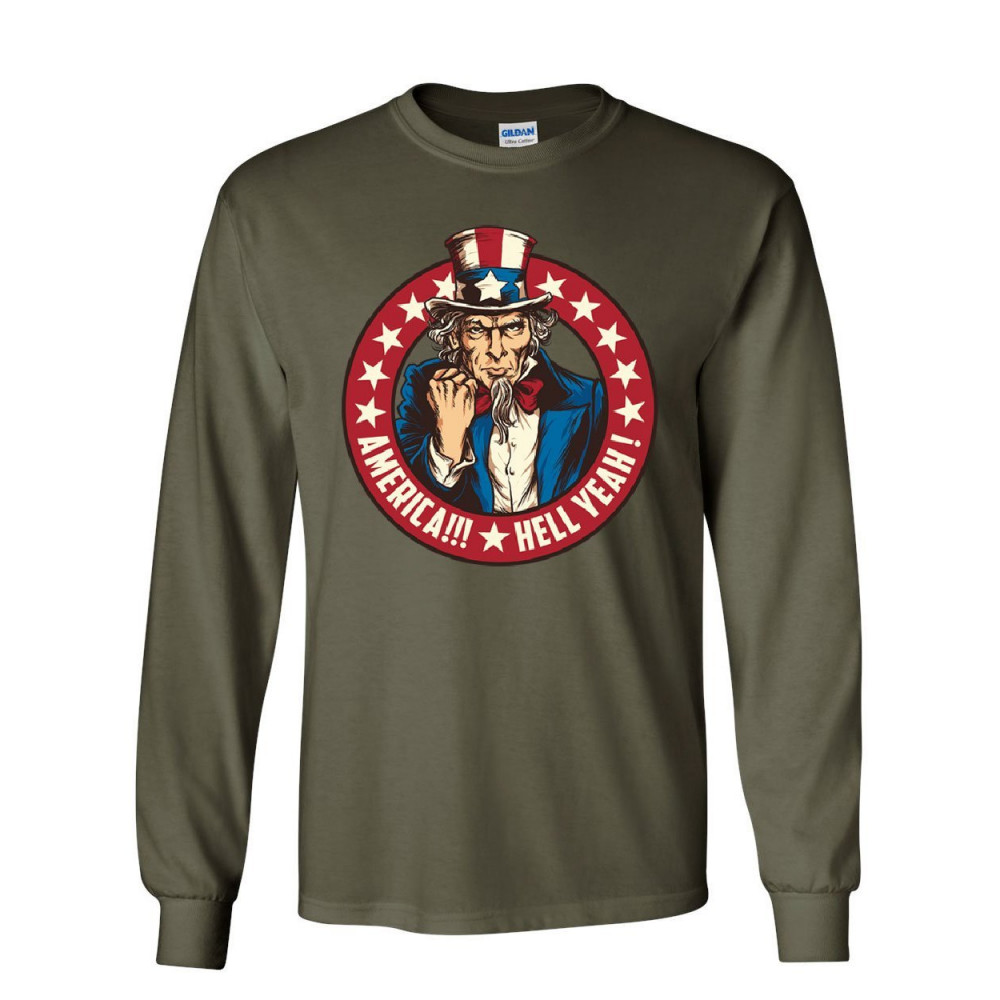 AMERICA HELL YEAH long sleeve t-shirt uncle sam patriotic stars and stripes tee military green