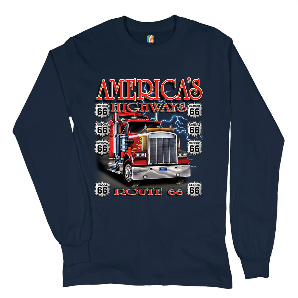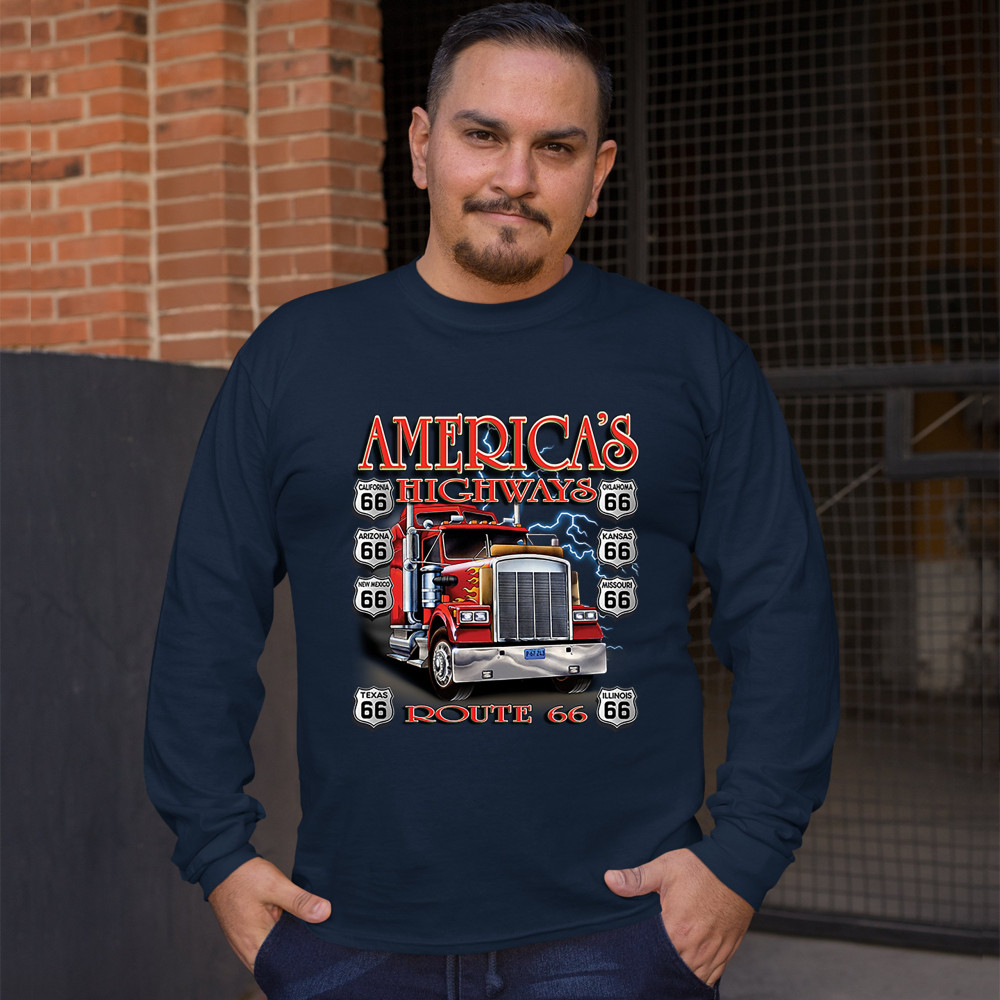 AMERICA'S HIGHWAYS ROUTE 66 long sleeve t-shirt truck driver mechanic teamster navy blue