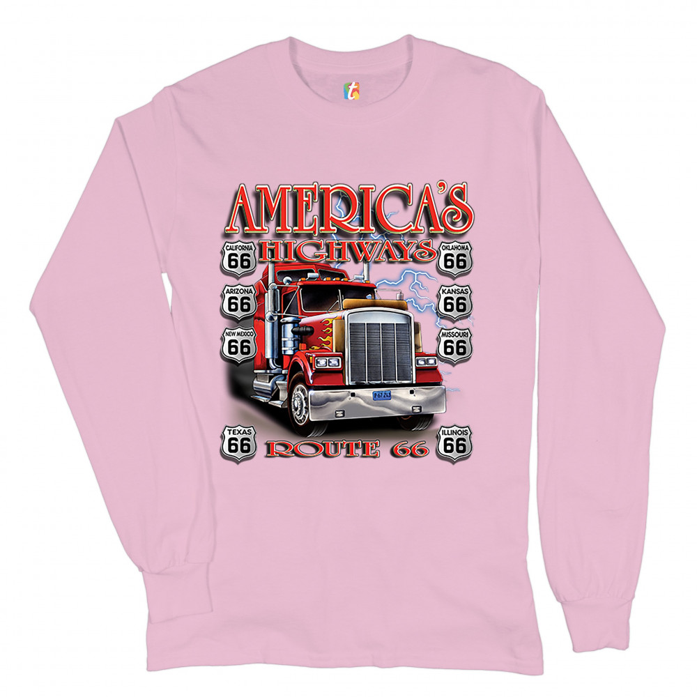 AMERICA'S HIGHWAYS ROUTE 66 long sleeve t-shirt truck driver mechanic teamster pink