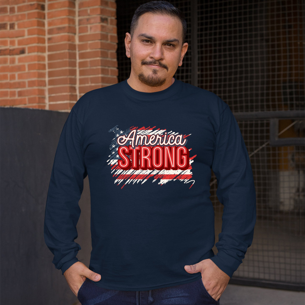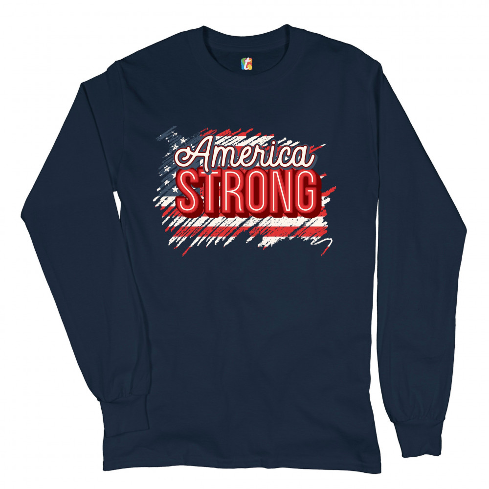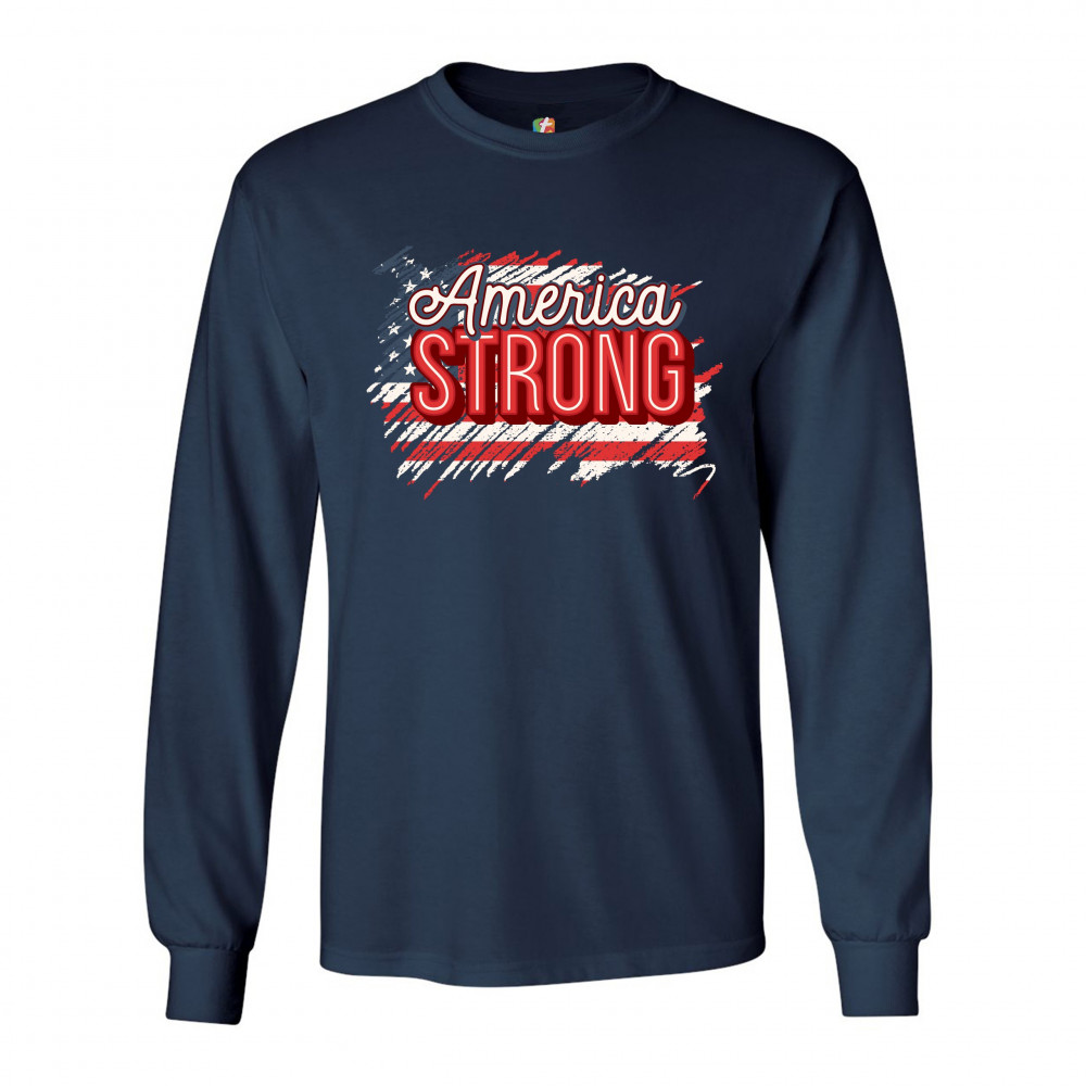 AMERICA STRONG long sleeve t-shirt distressed american flag 4th of july usa navy blue
