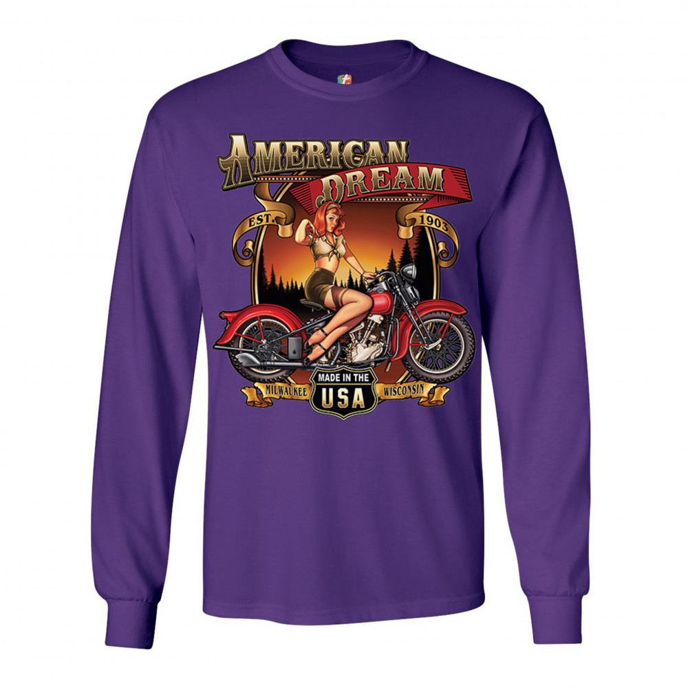 A print featuring a sexy pin up girl sitting on a vintage motorcycle. The print says: "American Dream est. 1903". In the bottom there is a sign saying: "made in the USA". To the left and right of it "Milwaukee Wisconsin" is written on a stripe. Great choice for any motorcycle enthusiast.