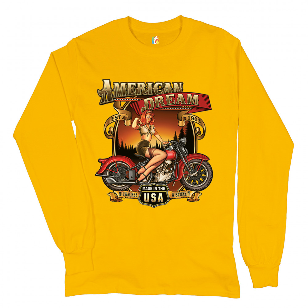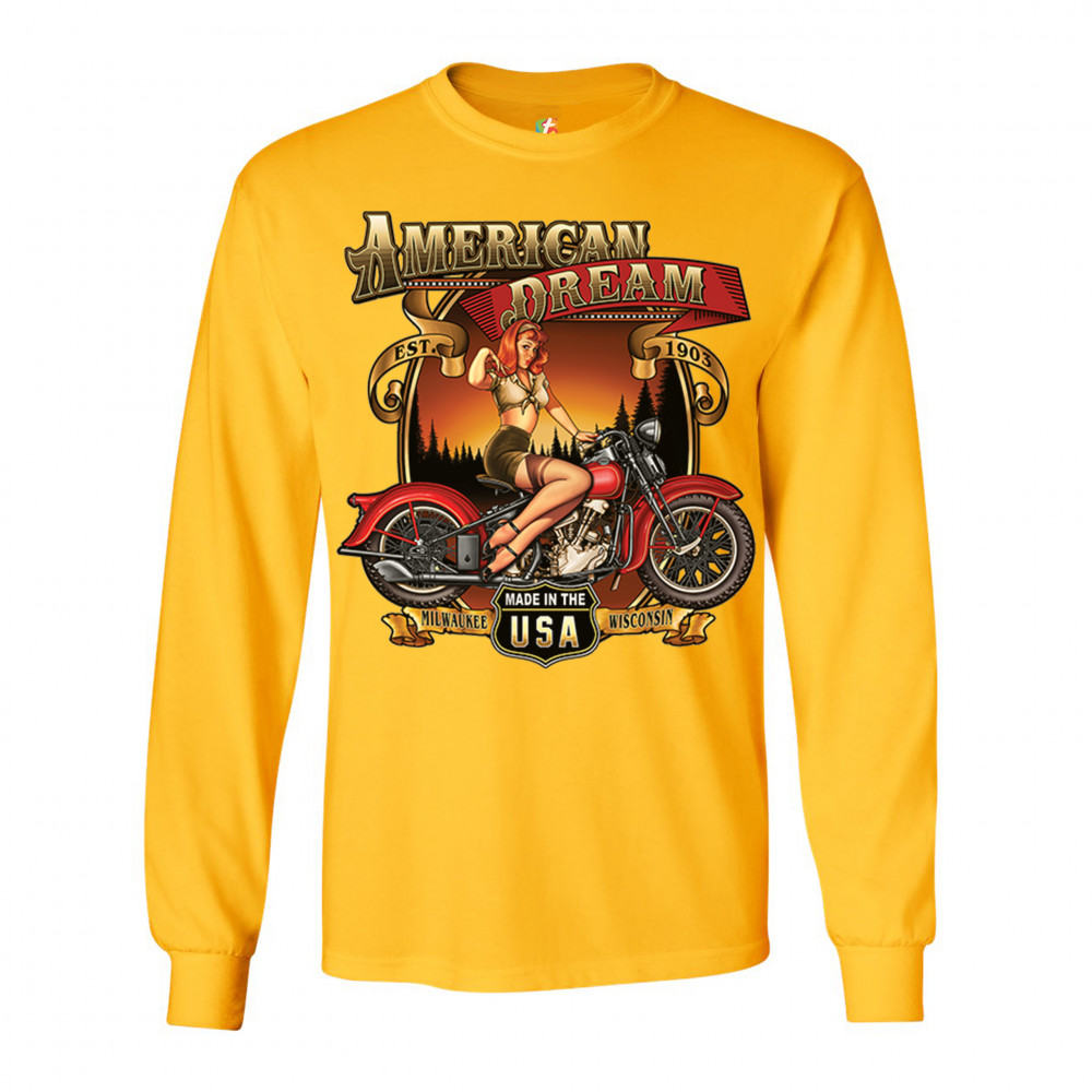 A print featuring a sexy pin up girl sitting on a vintage motorcycle. The print says: "American Dream est. 1903". In the bottom there is a sign saying: "made in the USA". To the left and right of it "Milwaukee Wisconsin" is written on a stripe. Great choice for any motorcycle enthusiast.