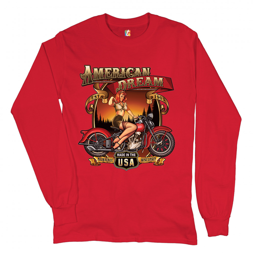 A print featuring a sexy pin up girl sitting on a vintage motorcycle. The print says: "American Dream est. 1903". In the bottom there is a sign saying: "made in the USA". To the left and right of it "Milwaukee Wisconsin" is written on a stripe. Great choice for any motorcycle enthusiast.