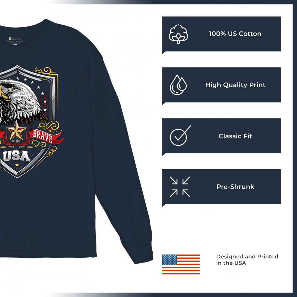 Honor American spirit with this patriotic eagle shield design shirt. Featuring a bold bald eagle emblem, stars and stripes shield, and red white blue accents, it’s perfect for Veteran’s Day, 4th of July, and military pride. A true American pride shirt for those who live by “home of the brave, land of the free.â€