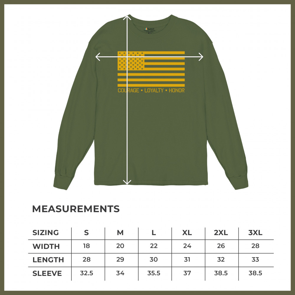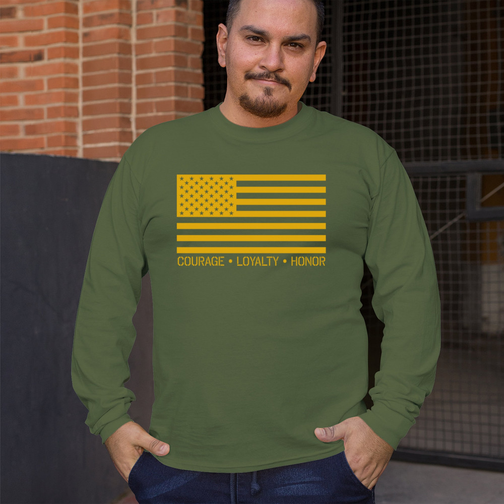 Honor the brave with our "Courage, Loyalty, Honor" USA flag shirt. Perfect for veterans and patriots. Ideal for Memorial Day and Veterans Day.