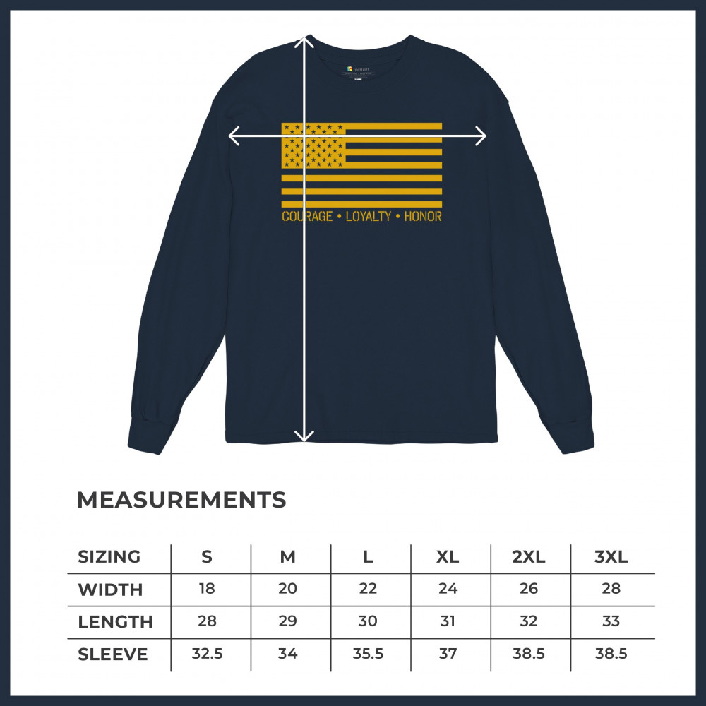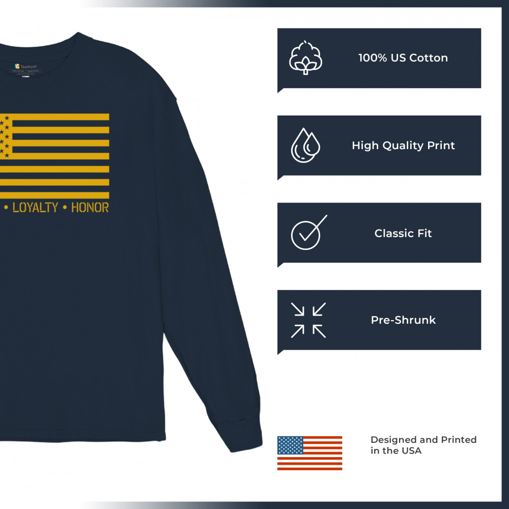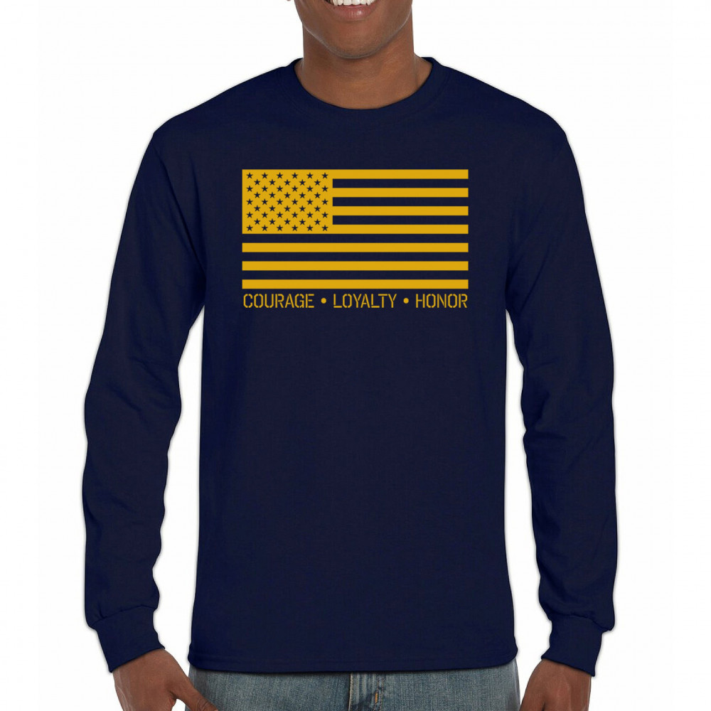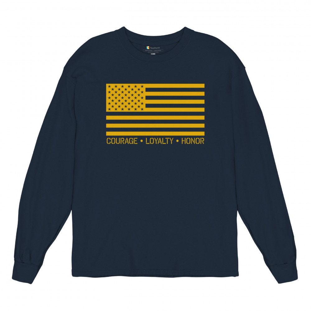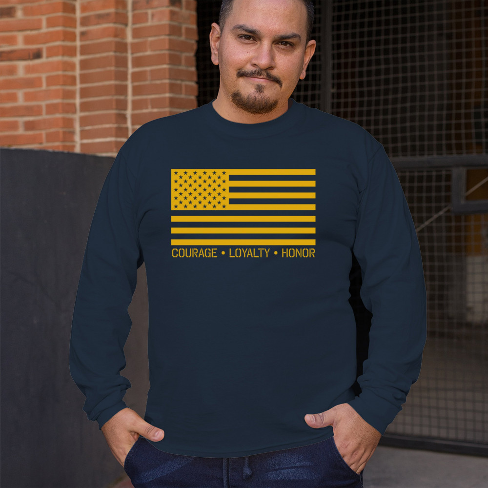Honor the brave with our "Courage, Loyalty, Honor" USA flag shirt. Perfect for veterans and patriots. Ideal for Memorial Day and Veterans Day.