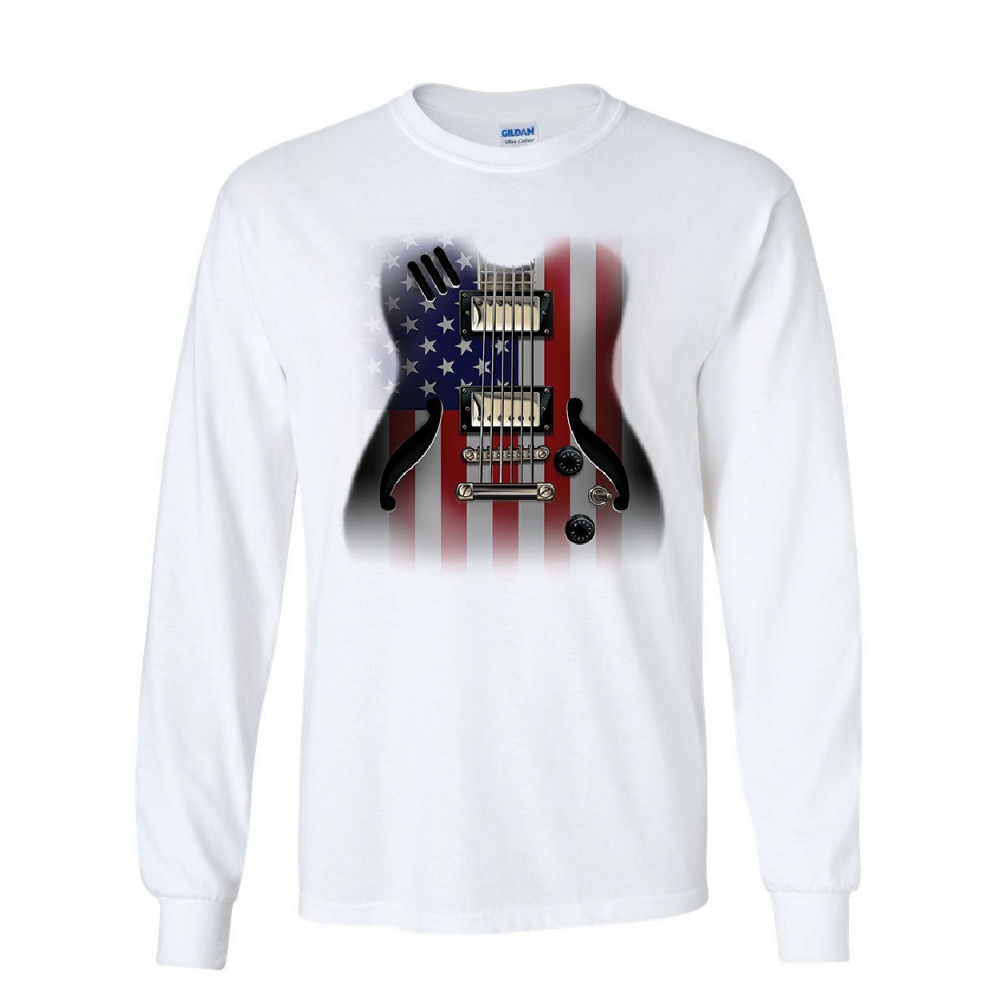 AMERICAN FLAG GUITAR long sleeve t-shirt rock and roll music art 4th of july tee white