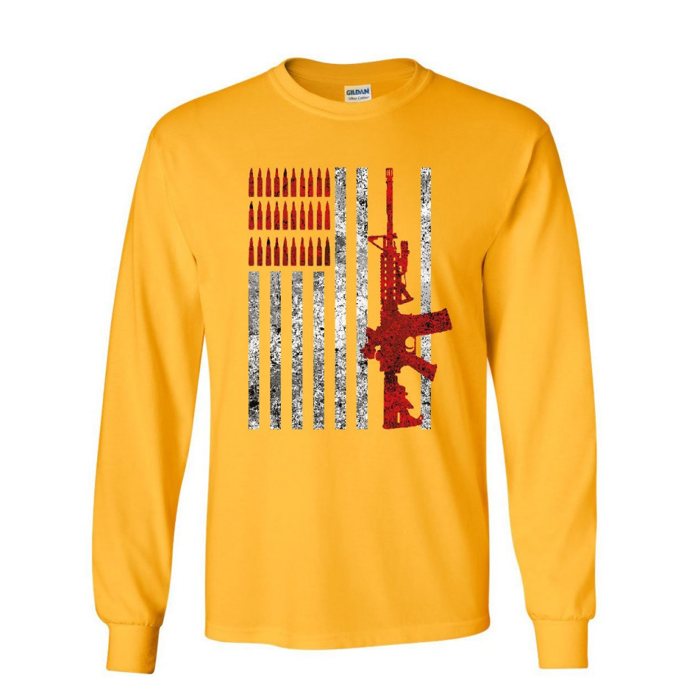 AMERICAL FLAG RIFLE long sleeve t-shirt 2nd amendment bullets ammo patriotic tee yellow