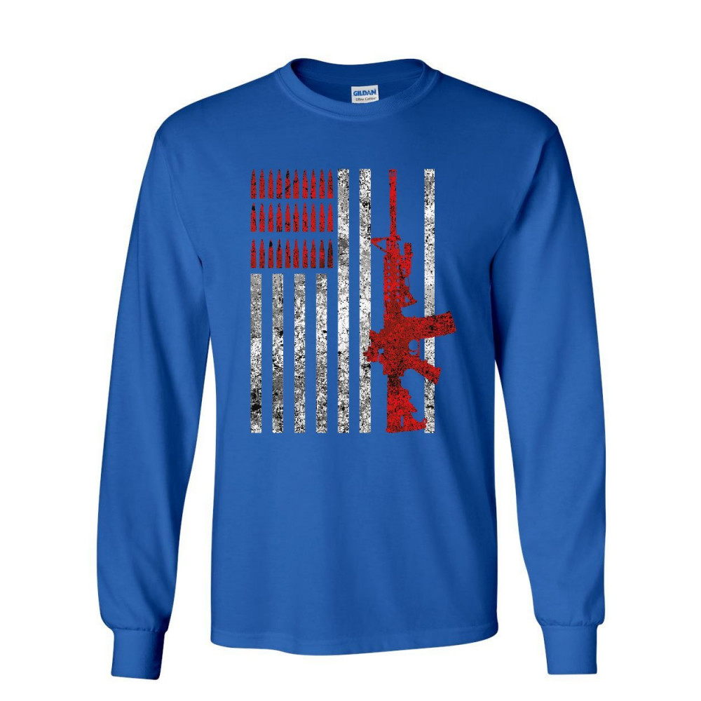AMERICAL FLAG RIFLE long sleeve t-shirt 2nd amendment bullets ammo patriotic tee royal blue