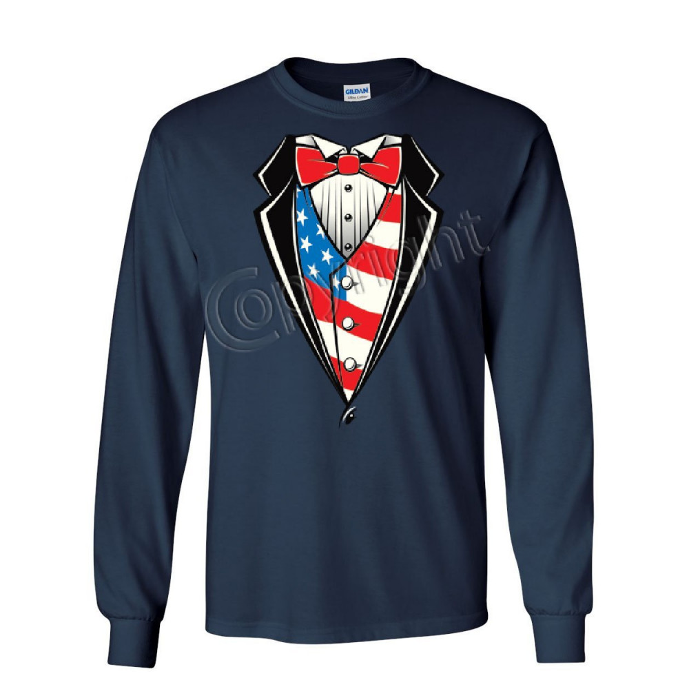 AMERICAN FLAG TUXEDO long sleeve t-shirt funny 4th of july stars and stripes tee navy blue