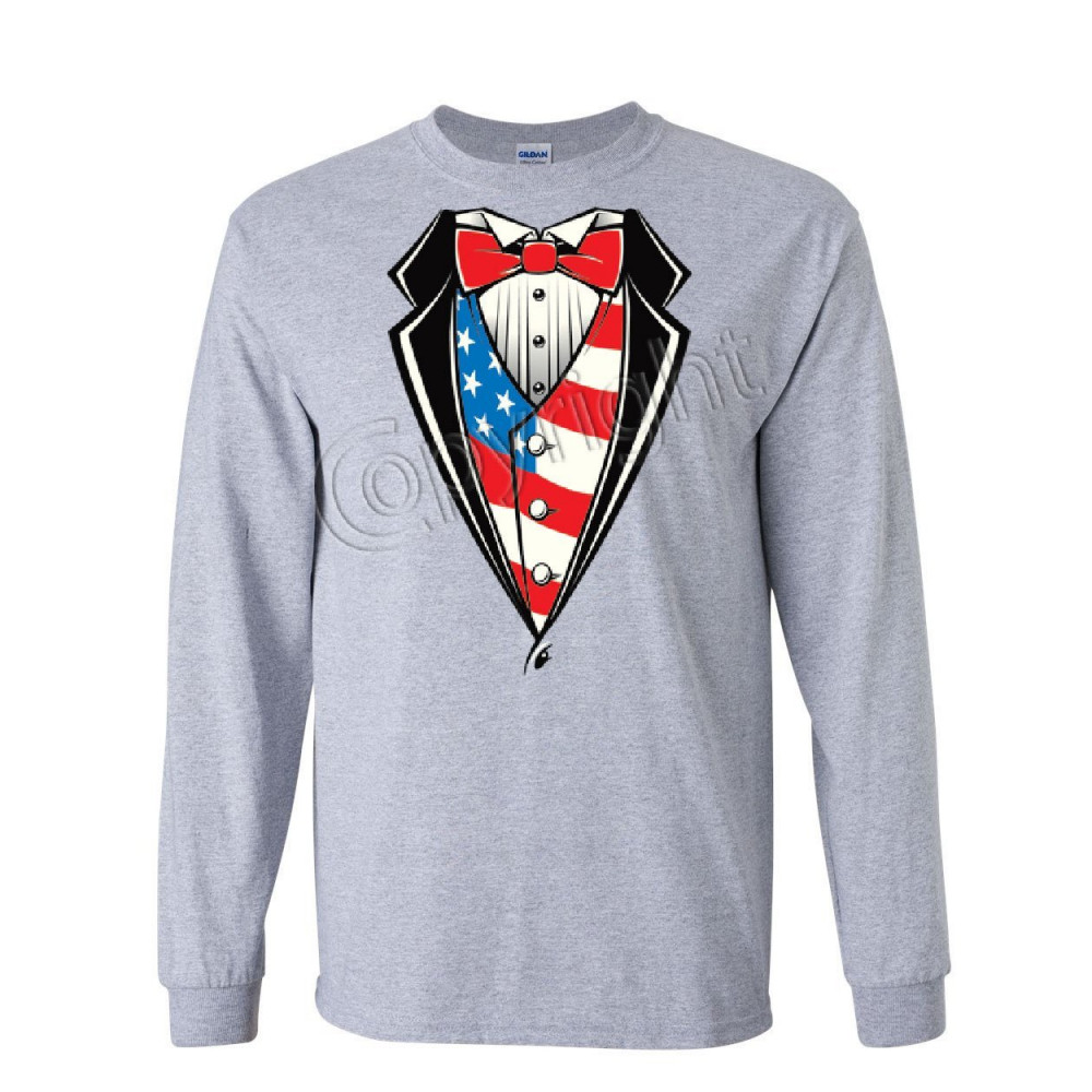 AMERICAN FLAG TUXEDO long sleeve t-shirt funny 4th of july stars and stripes tee gray