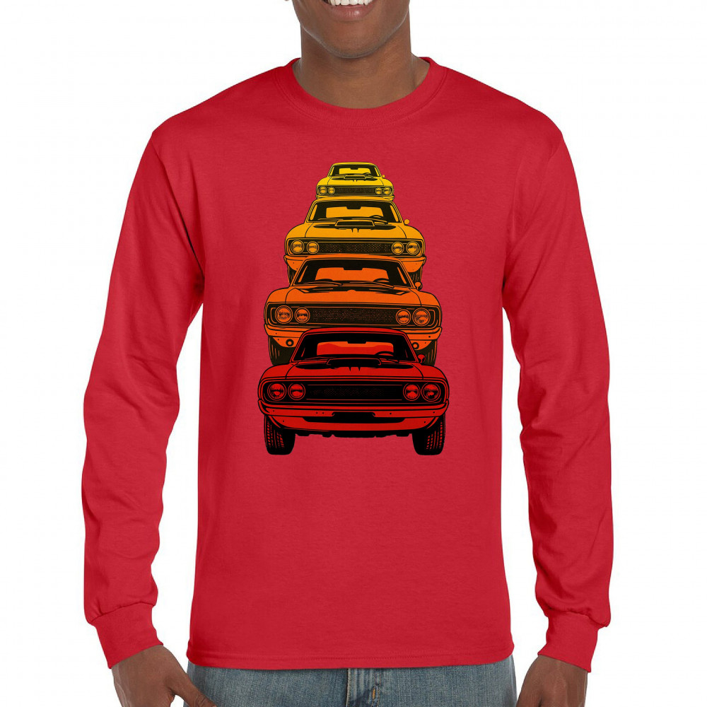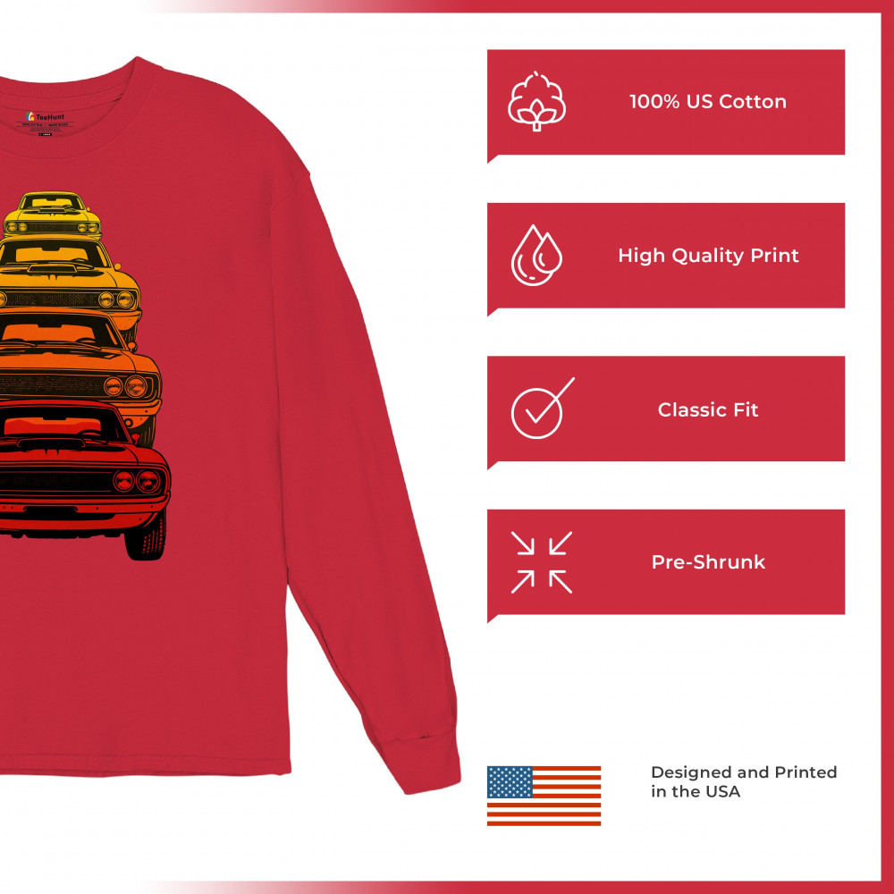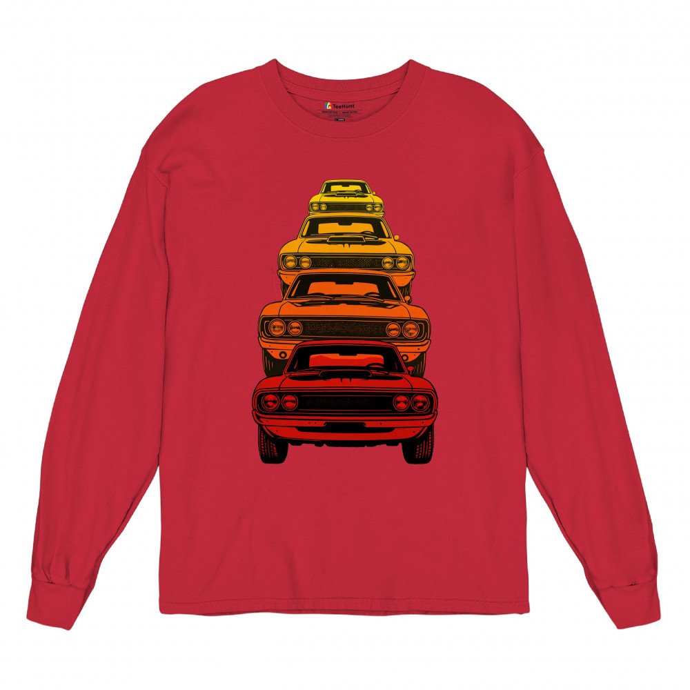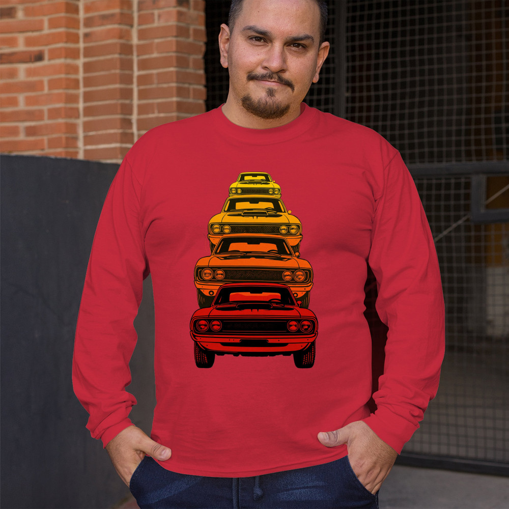 Celebrate horsepower heritage with this colorful lineup of classic muscle cars. Featuring a stacked gradient from red to yellow, this design brings bold retro attitude, V8 pride, and American torque to life. Perfect for collectors, gearheads, and fans of classic car power.