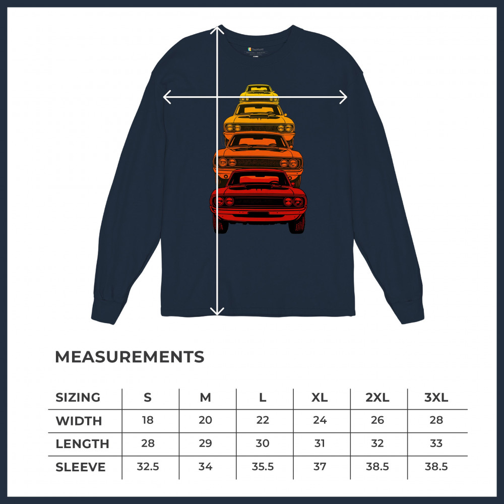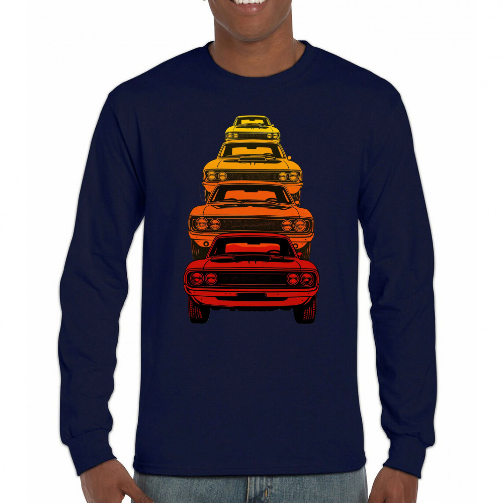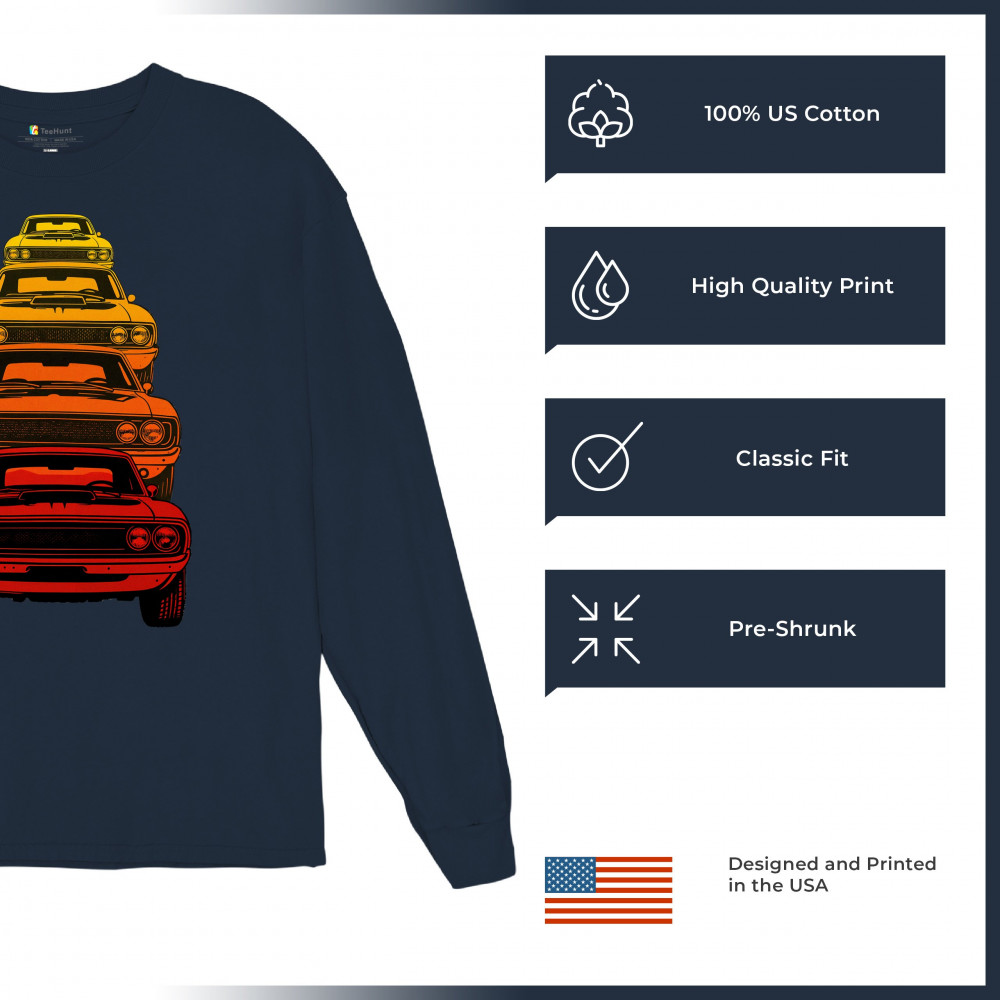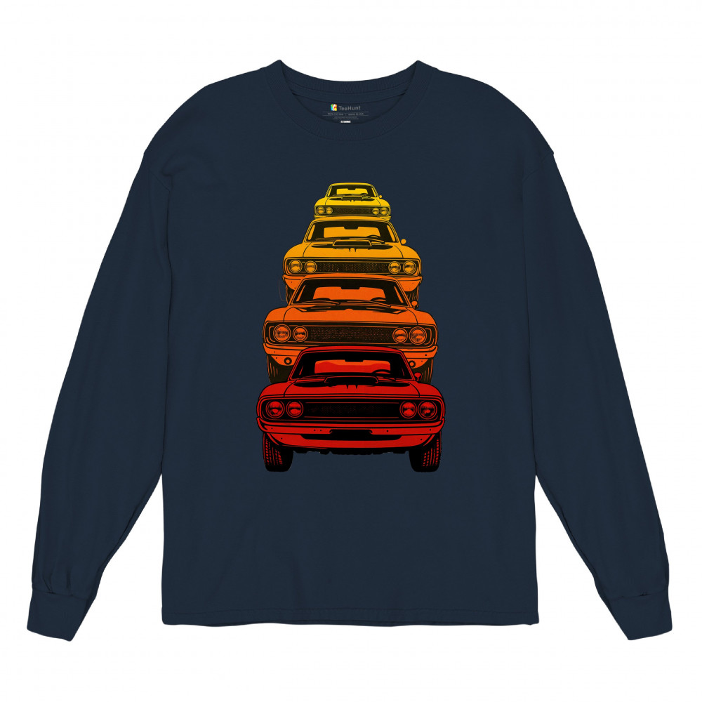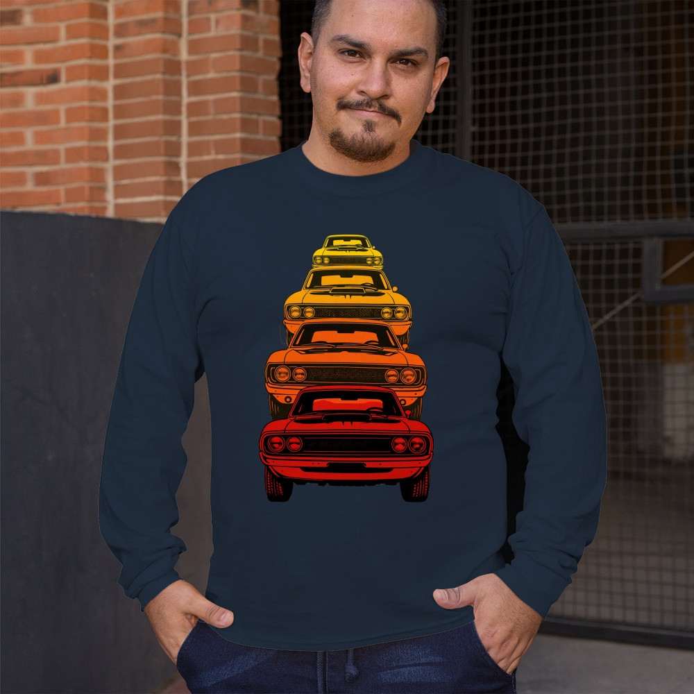 Celebrate horsepower heritage with this colorful lineup of classic muscle cars. Featuring a stacked gradient from red to yellow, this design brings bold retro attitude, V8 pride, and American torque to life. Perfect for collectors, gearheads, and fans of classic car power.