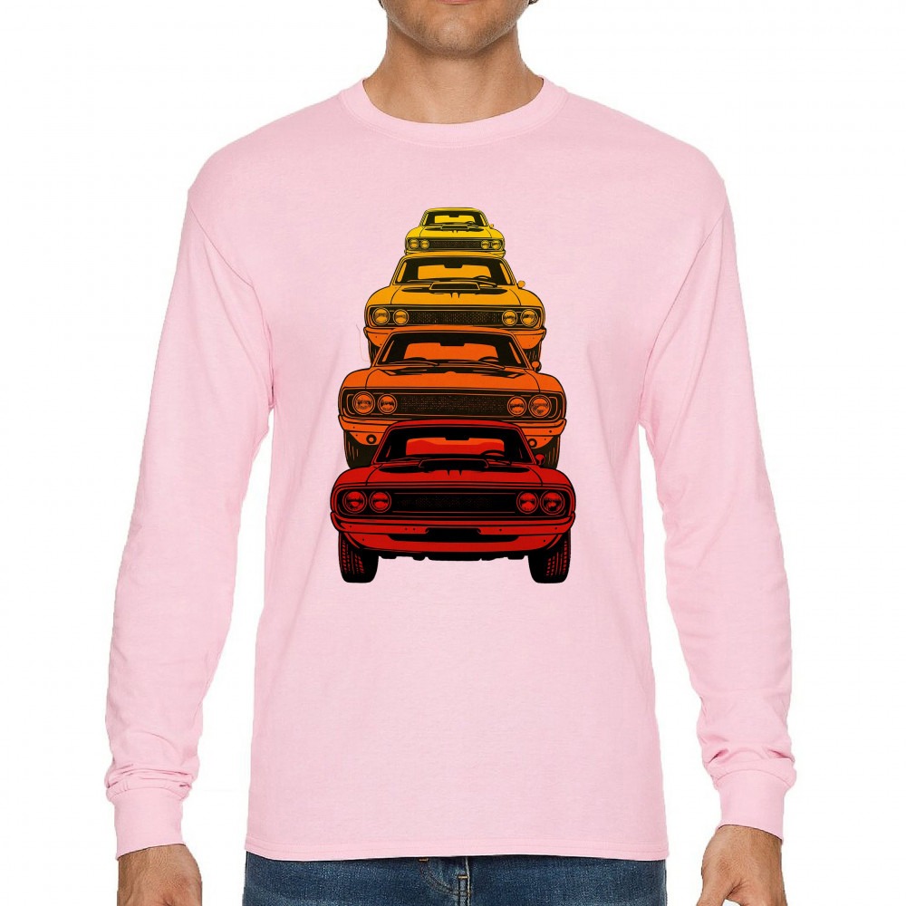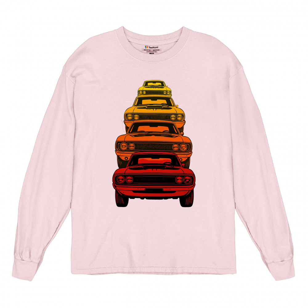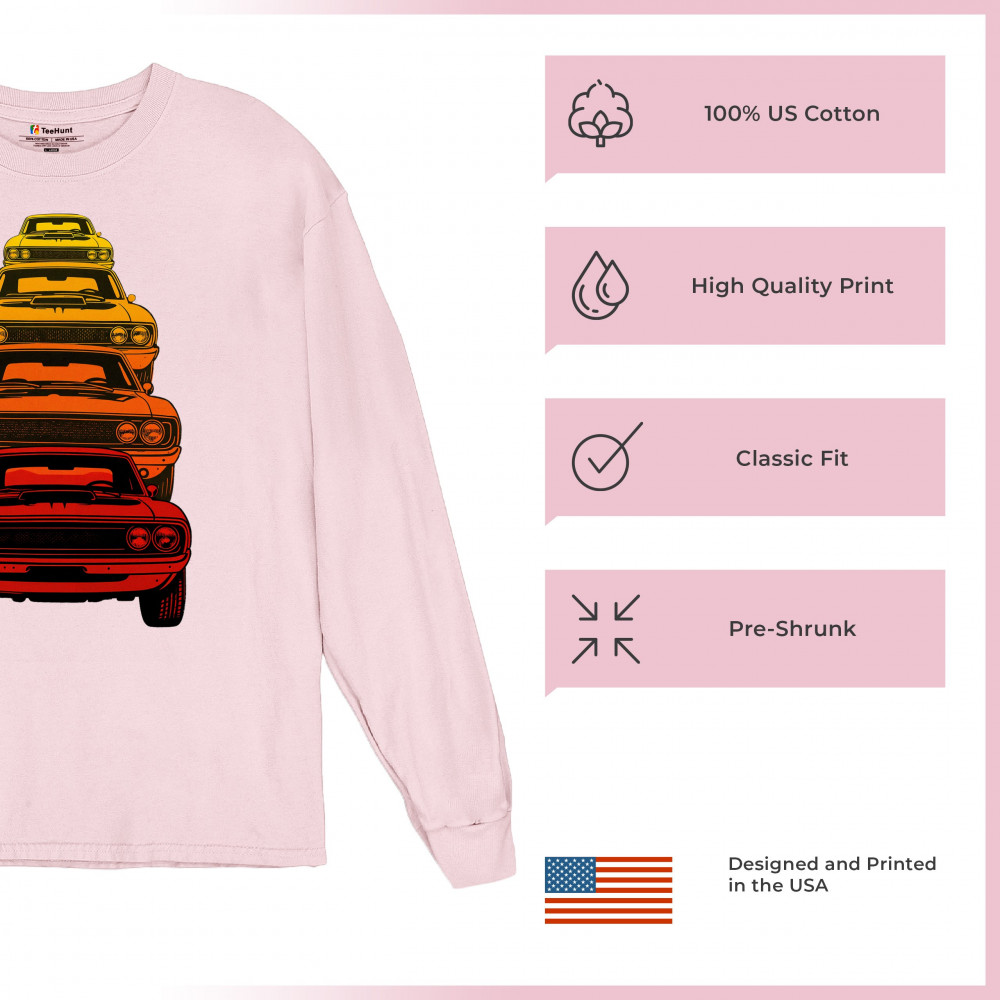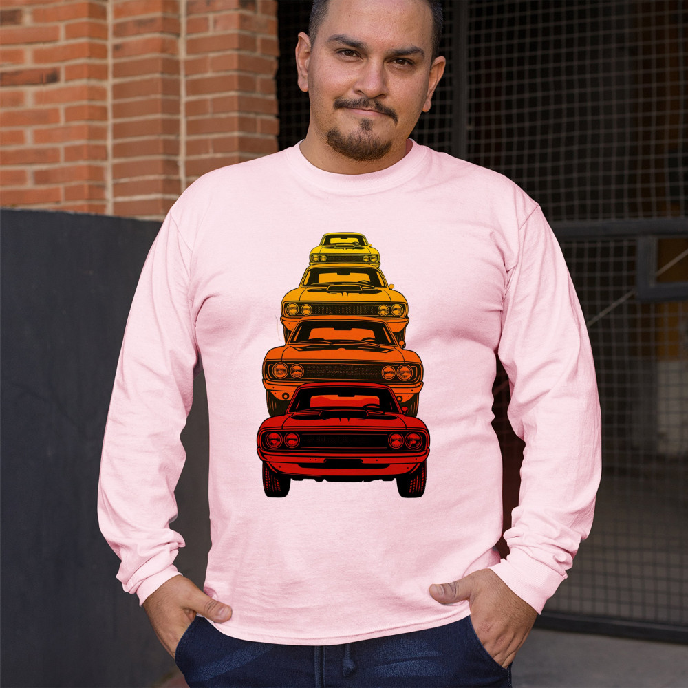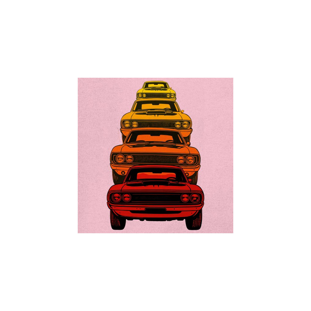 Celebrate horsepower heritage with this colorful lineup of classic muscle cars. Featuring a stacked gradient from red to yellow, this design brings bold retro attitude, V8 pride, and American torque to life. Perfect for collectors, gearheads, and fans of classic car power.