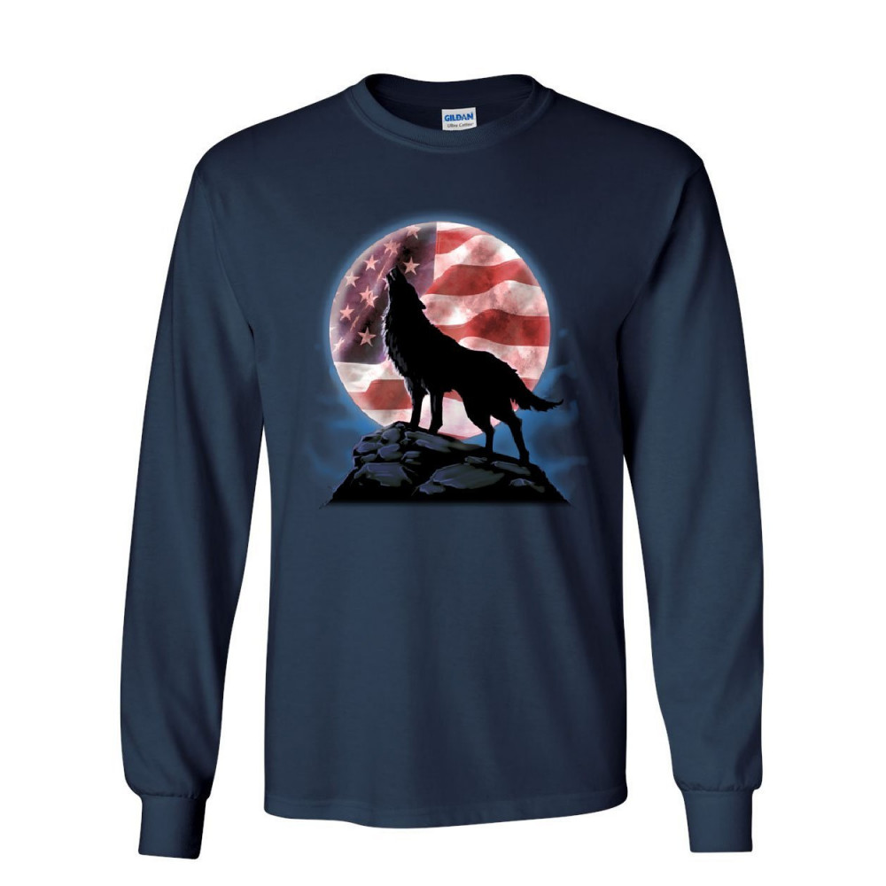 AMERICAN HOWLING WOLF long sleeve t-shirt wildlife animal wolves wilderness tee navy blue