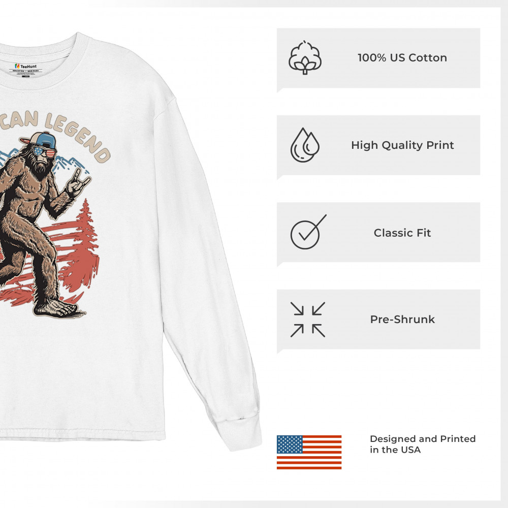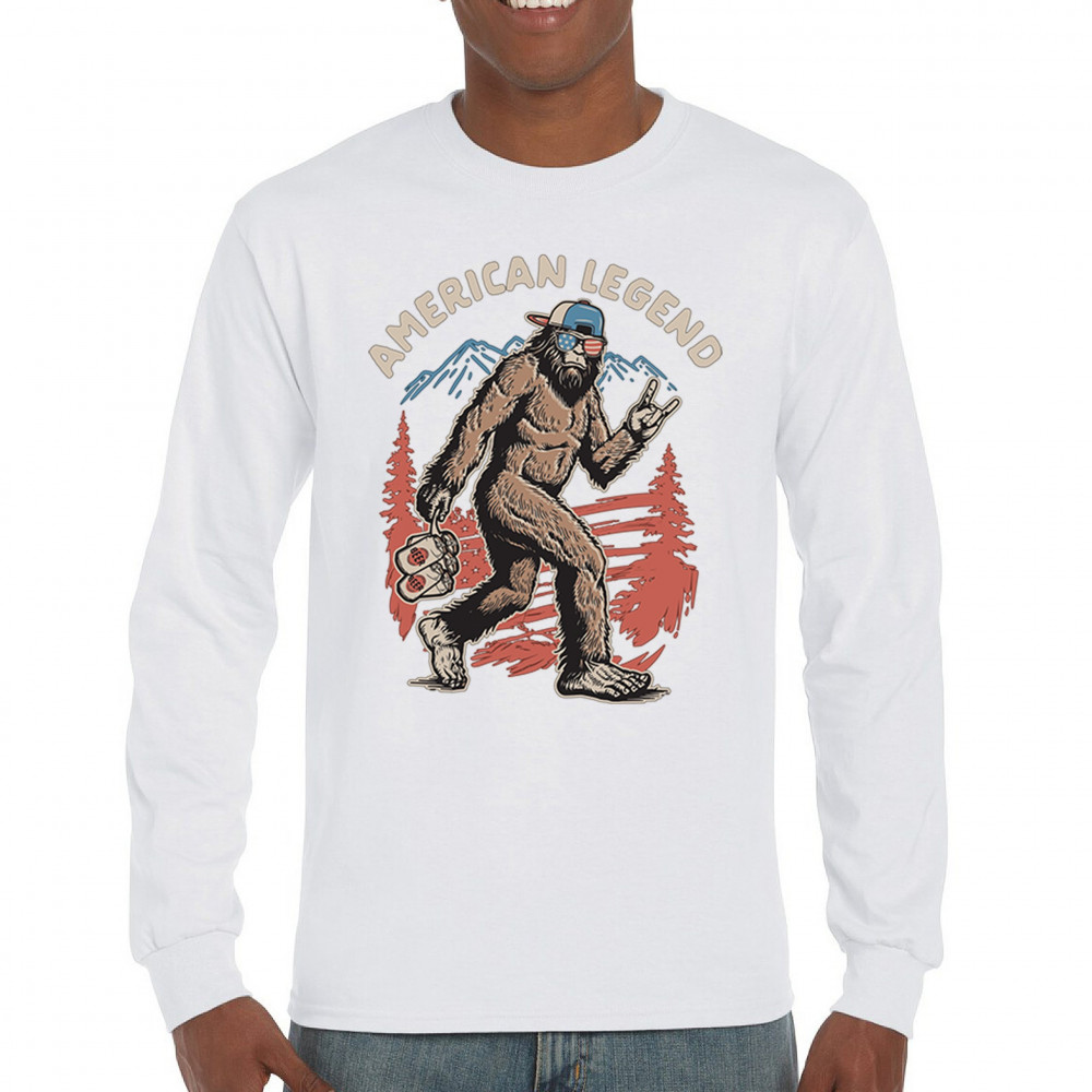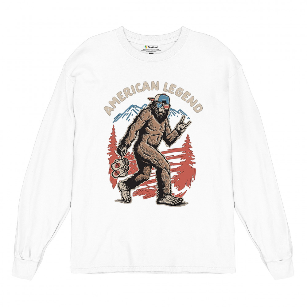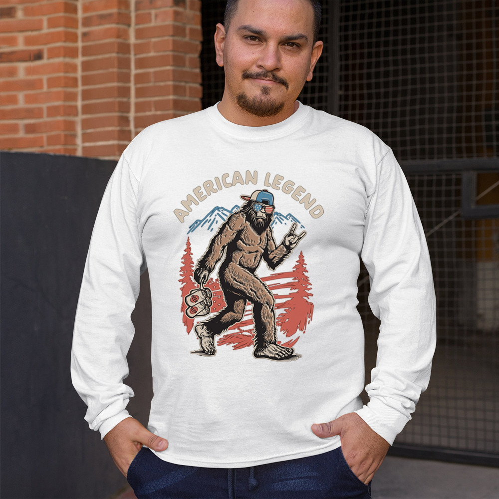 Funny Bigfoot design with patriotic flair—ideal for BBQs, beer lovers, campers, and cryptid fans who love to party in style!