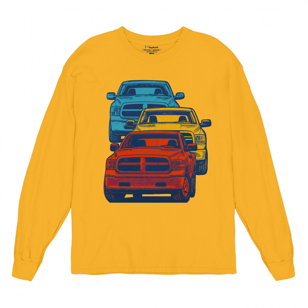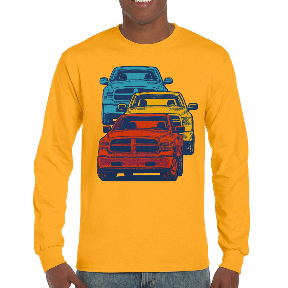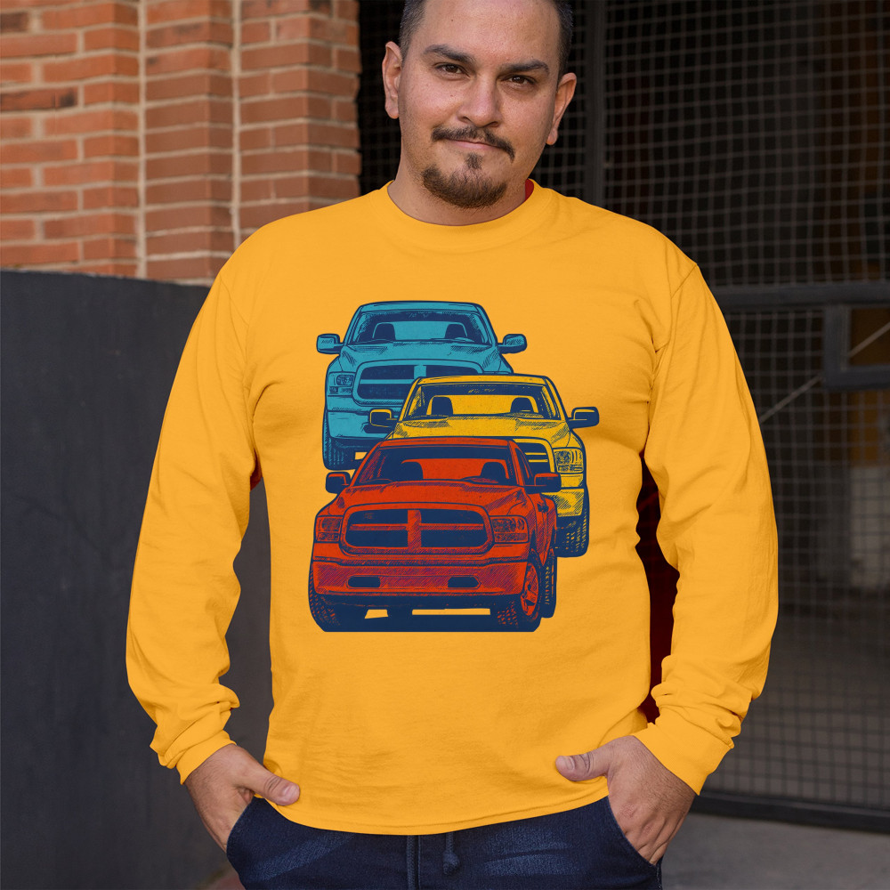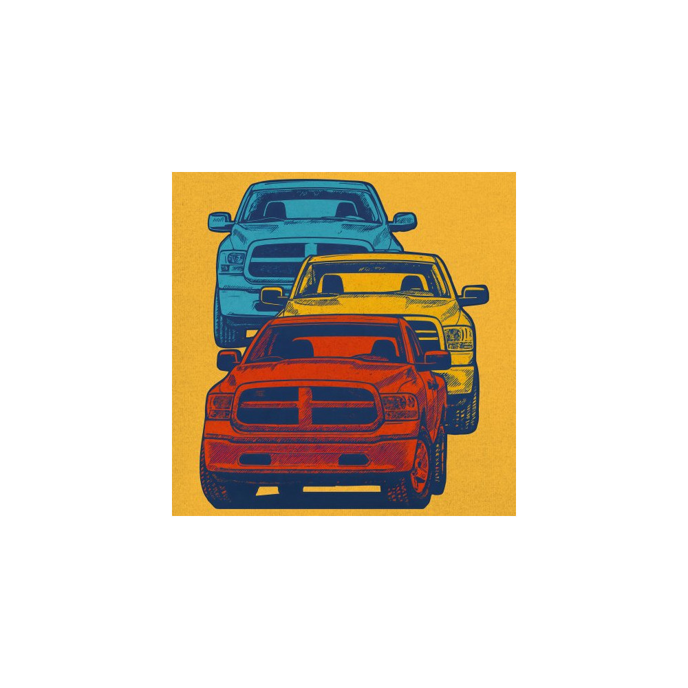 Boldly stacked and powerfully styled, this multicolor truck design showcases red, yellow, and blue pickups in a vertical formation. Made for fans of lifted truck culture, horsepower, and off-road pride, it celebrates diesel grit, road attitude, and the spirit of truck meets and gearhead unity.