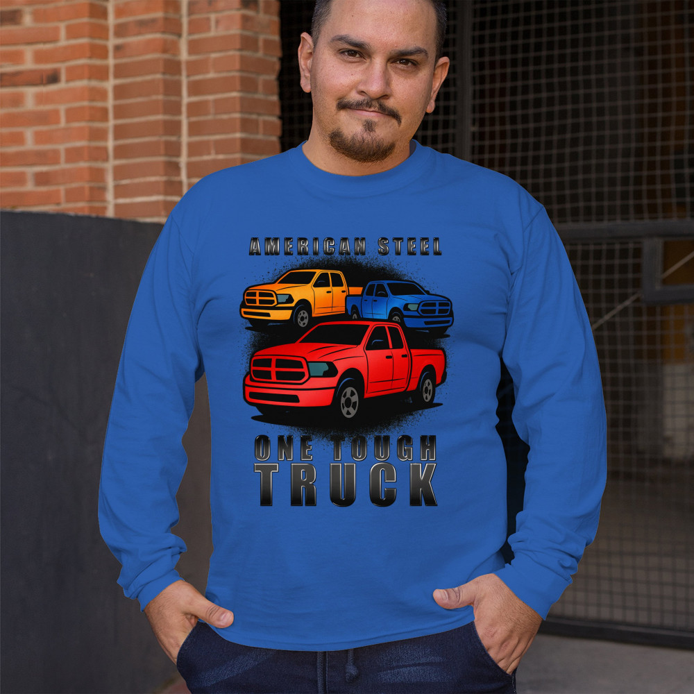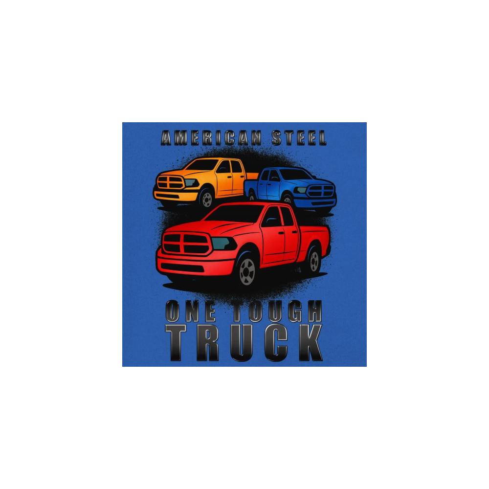 Bold truck design with red, yellow, and blue pickups. Built for fans of American steel, tough performance, and road warrior pride.