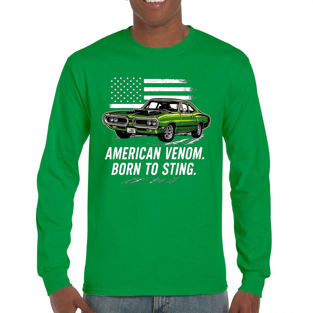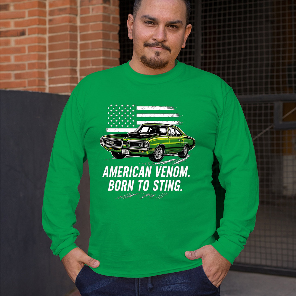 Inject venom into your street style with this bold green muscle car design. With “Born to Sting†power and a backdrop of American pride, this graphic is perfect for Scat fans, gearheads, and drivers who embrace speed, dominance, and the sound of true muscle. Rule car meets, rev battles, and highway runs with unmatched attitude.