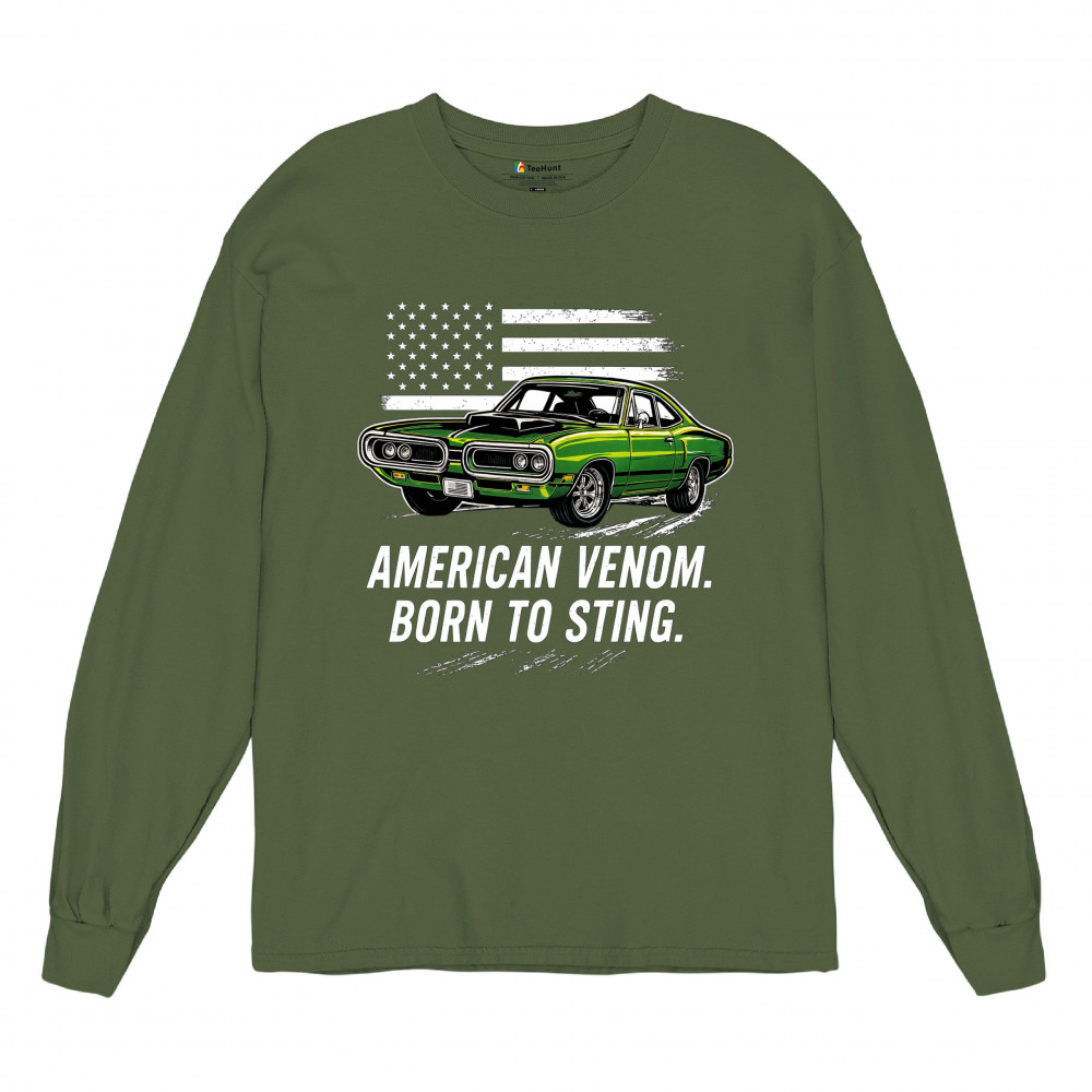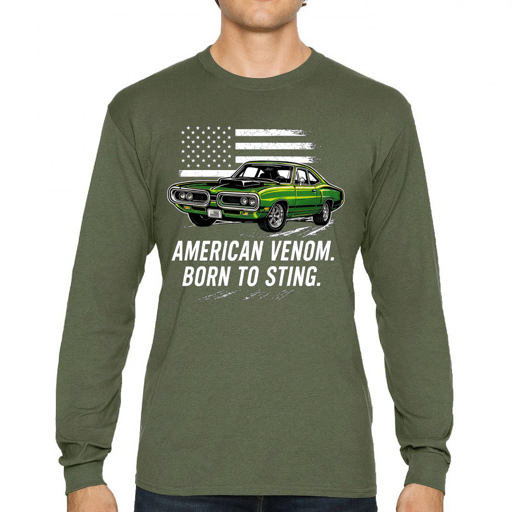 Inject venom into your street style with this bold green muscle car design. With “Born to Sting†power and a backdrop of American pride, this graphic is perfect for Scat fans, gearheads, and drivers who embrace speed, dominance, and the sound of true muscle. Rule car meets, rev battles, and highway runs with unmatched attitude.