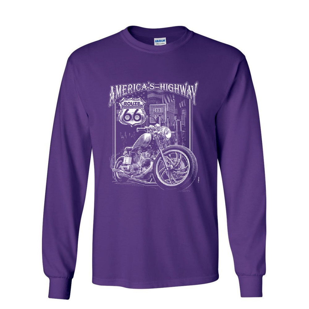 AMERICA'S HIGHWAY HISTORIC ROUTE 66 america's highway long sleeve t-shirt route 66 mc motorcycle chopper bobber tee purple